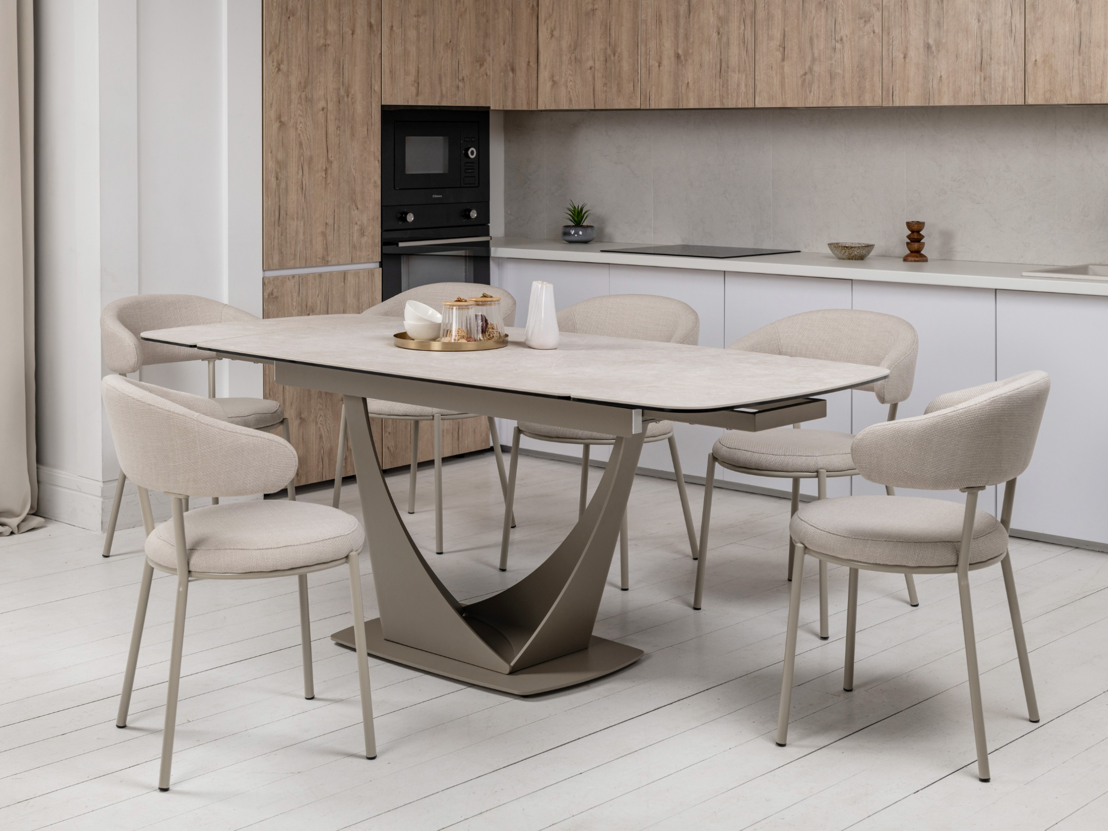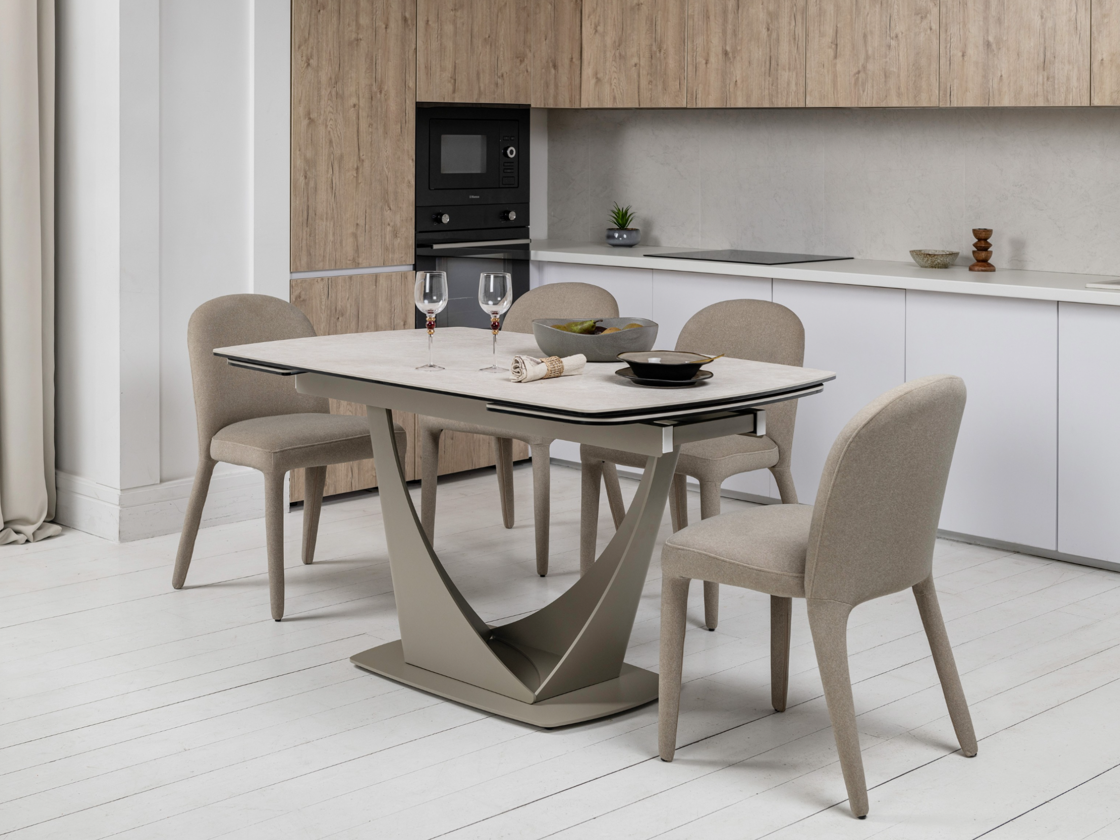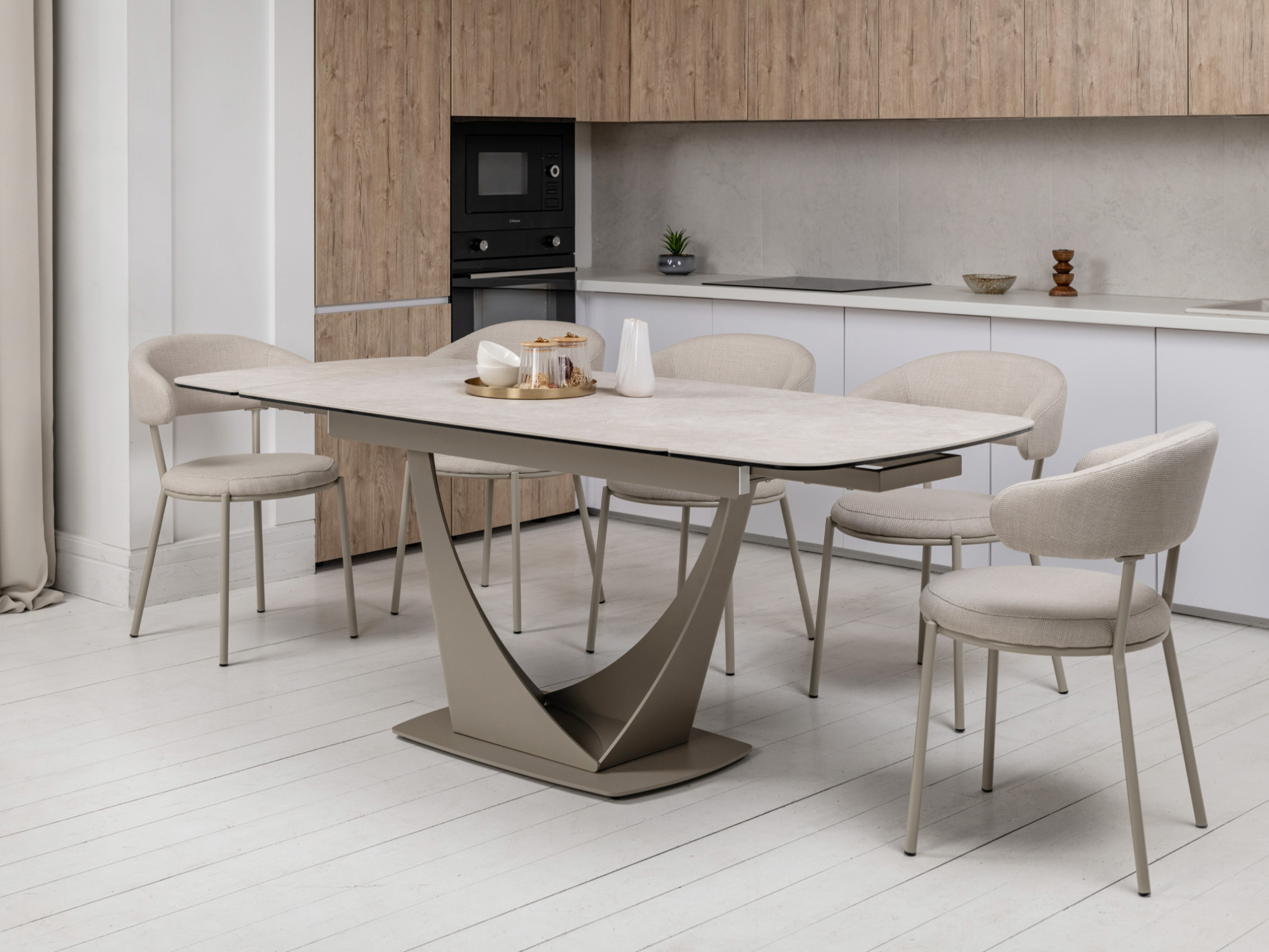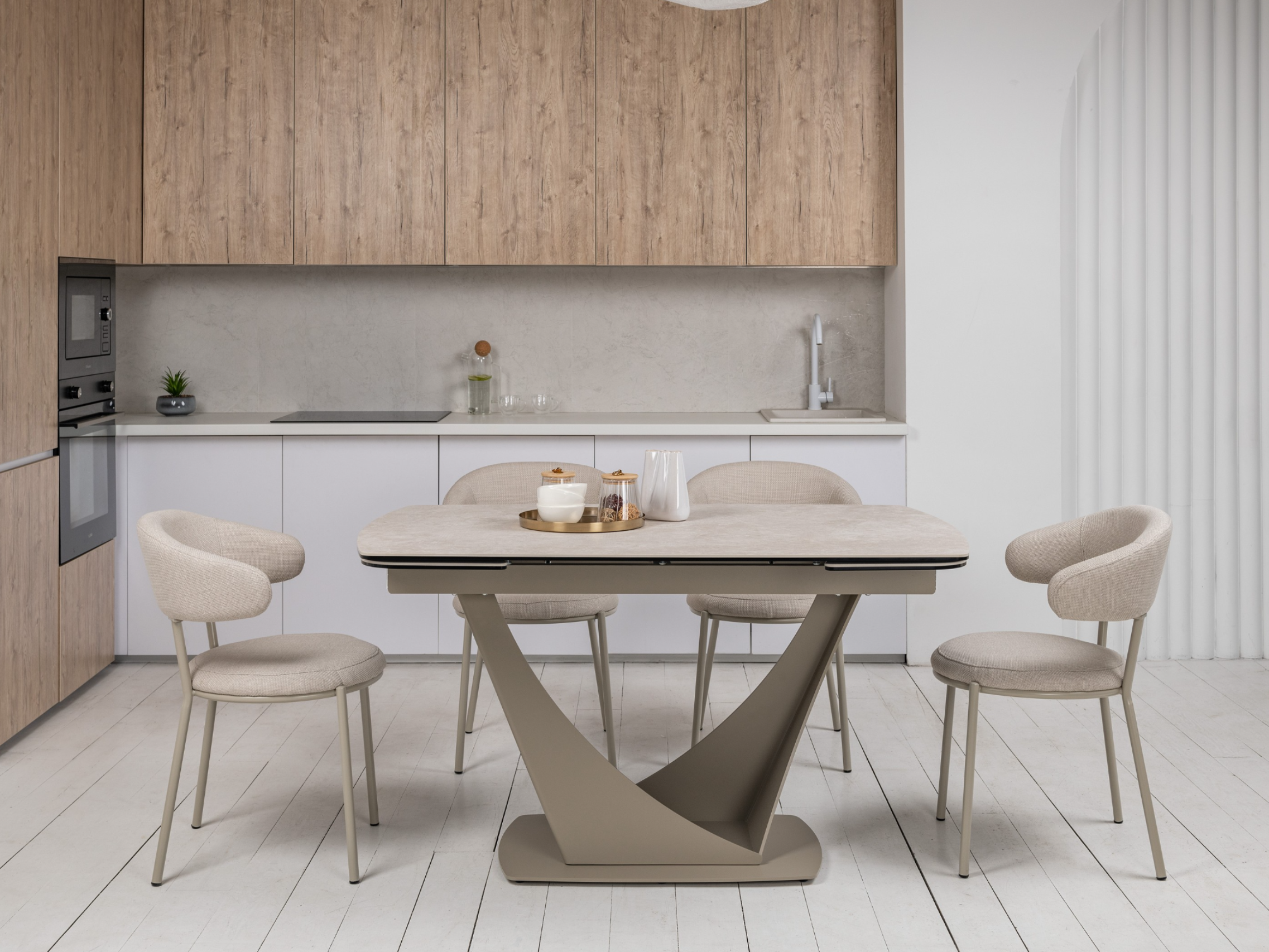 Колір "сахара" і бежевий відтінок основи роблять цей стіл витонченим і універсальним. Матова поверхня керамічної стільниці додає сучасного вигляду й легко поєднується з іншими елементами інтер'єру.