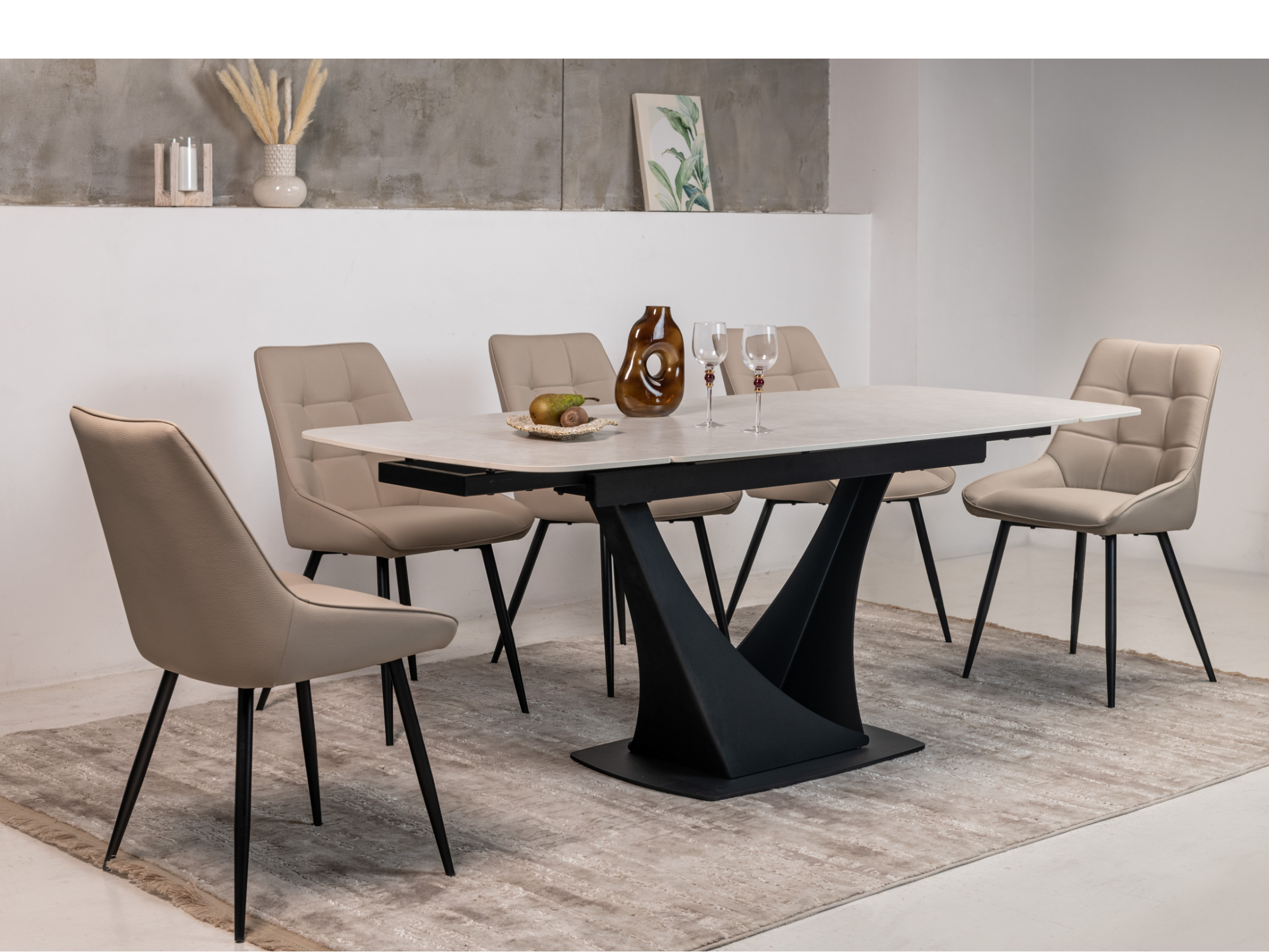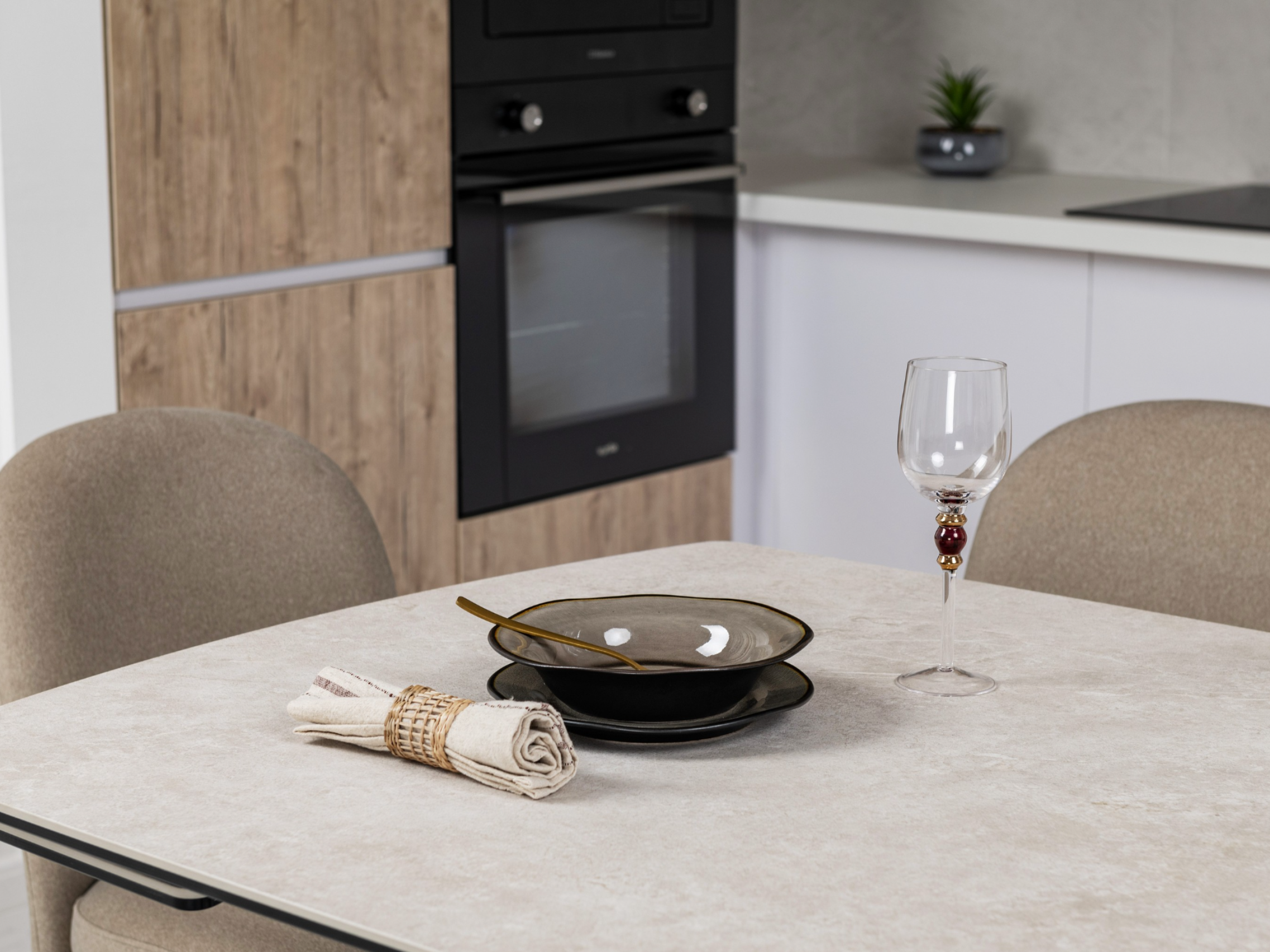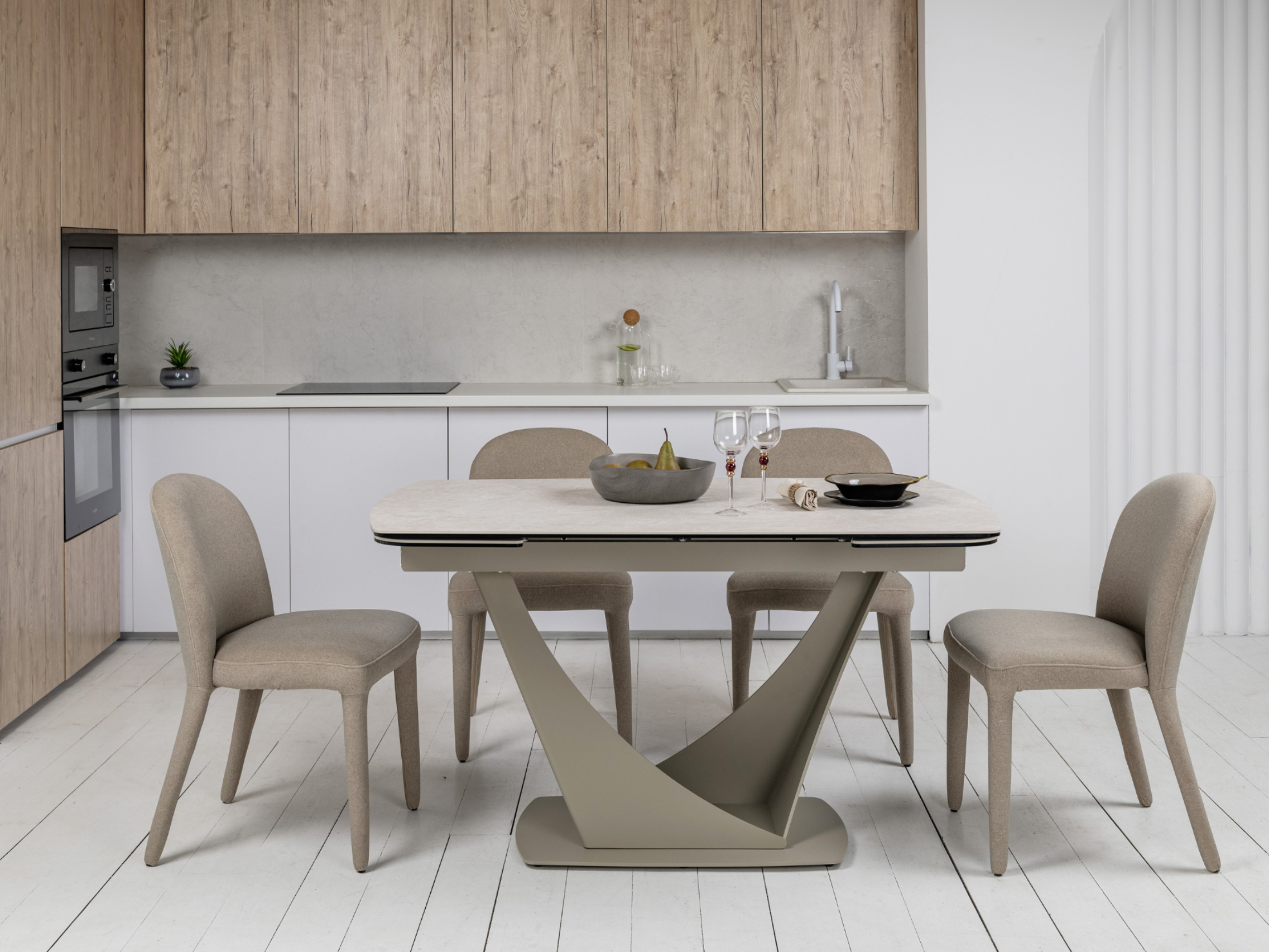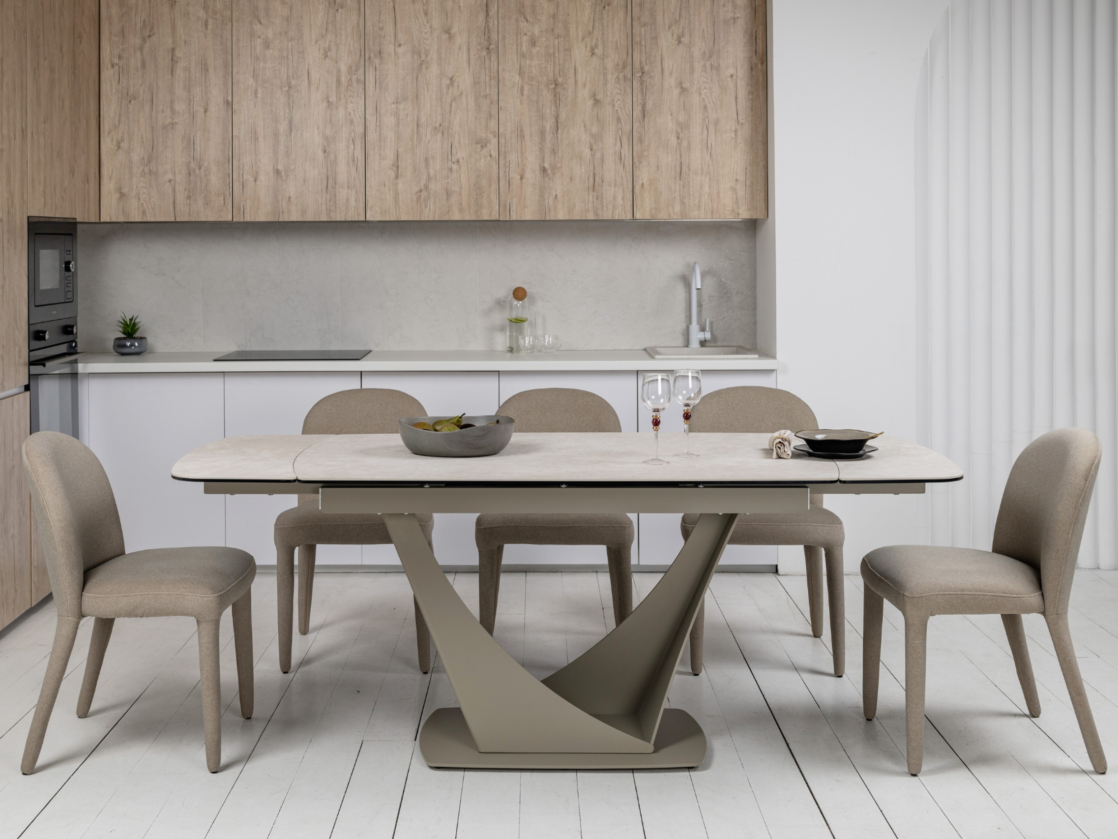 Колір "сахара" і бежевий відтінок основи роблять цей стіл витонченим і універсальним. Матова поверхня керамічної стільниці додає сучасного вигляду й легко поєднується з іншими елементами інтер'єру.
