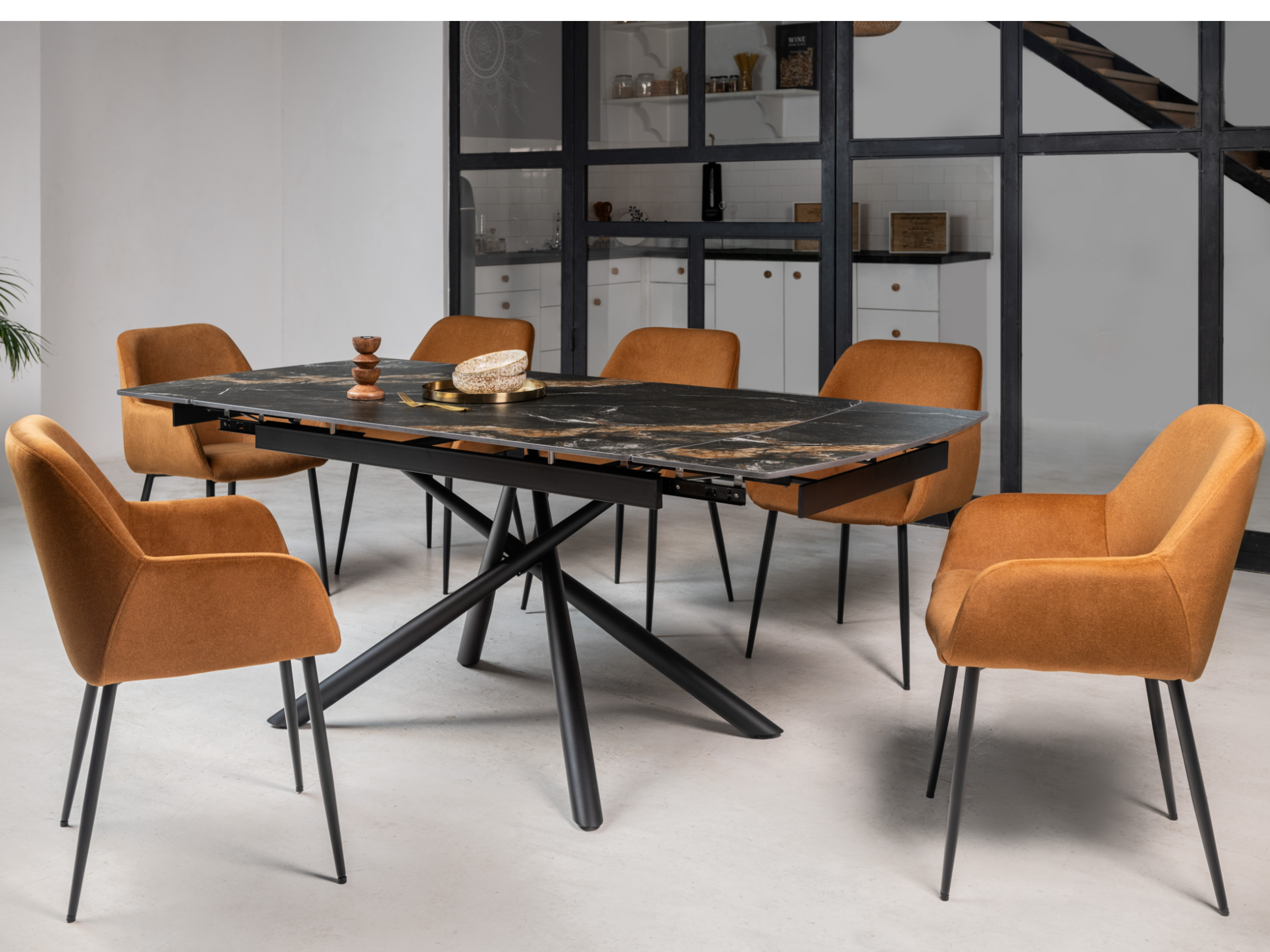 В поєднанні з білою металевою основою, стіл набуває елегантного, сучасного вигляду.