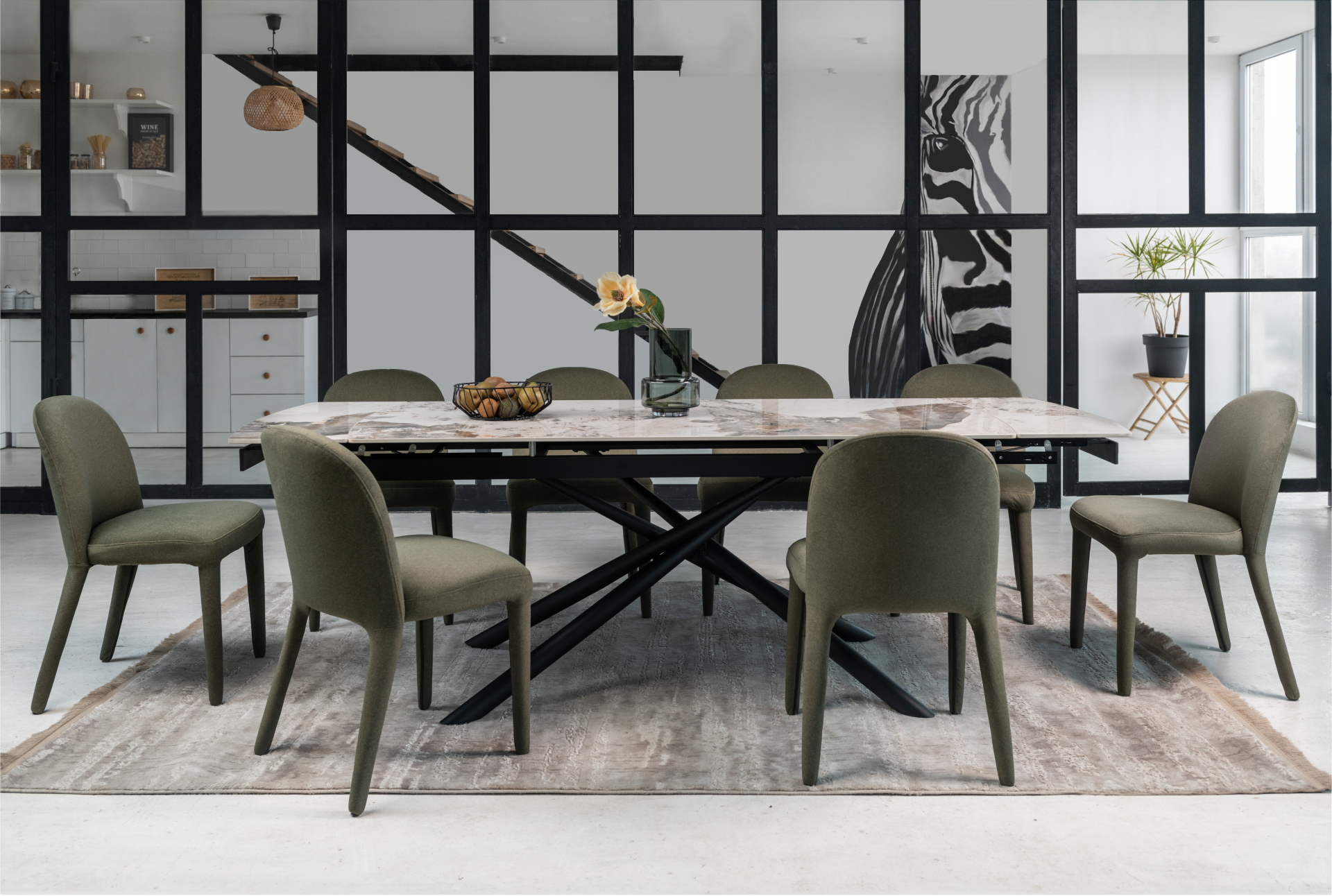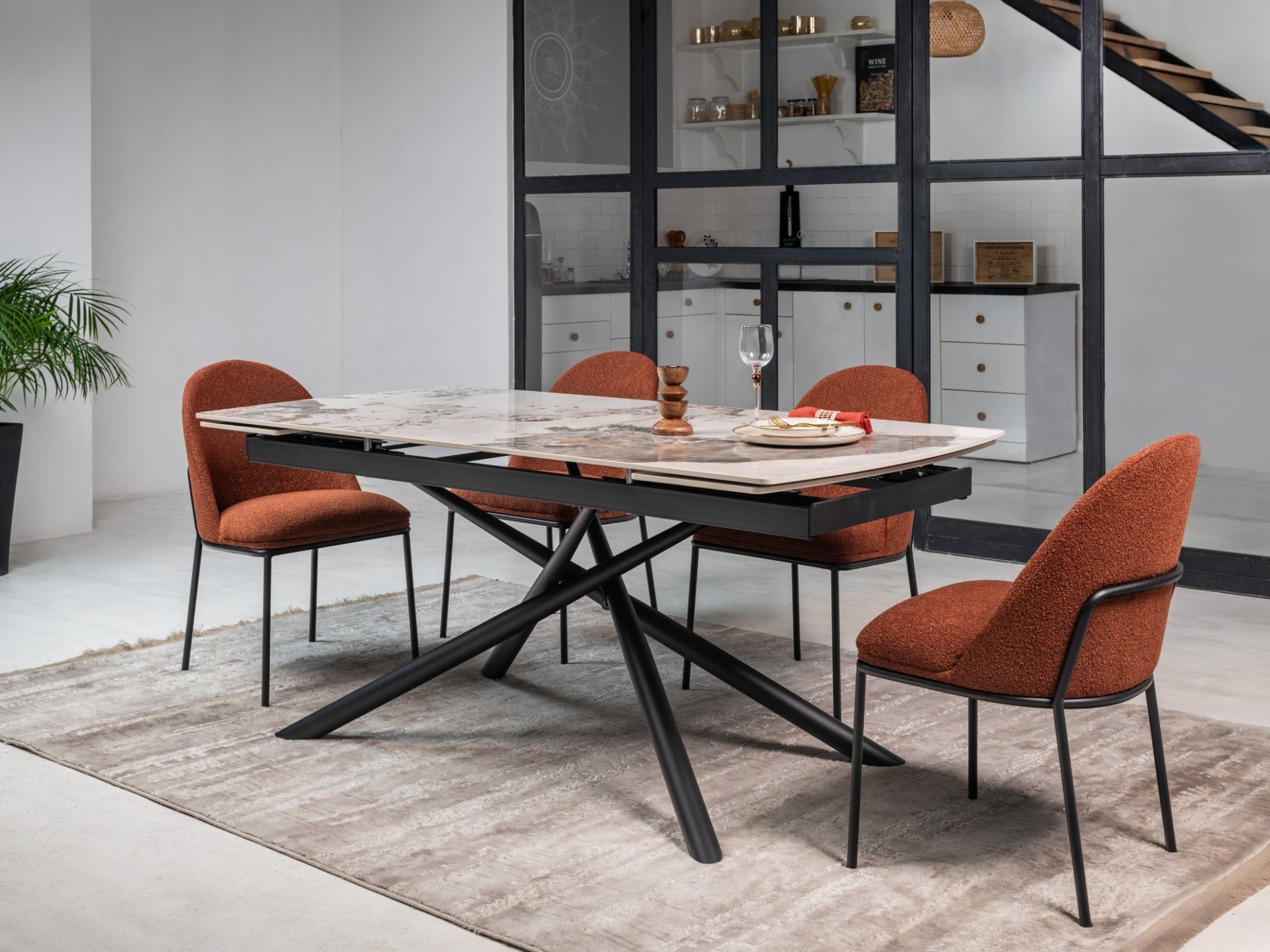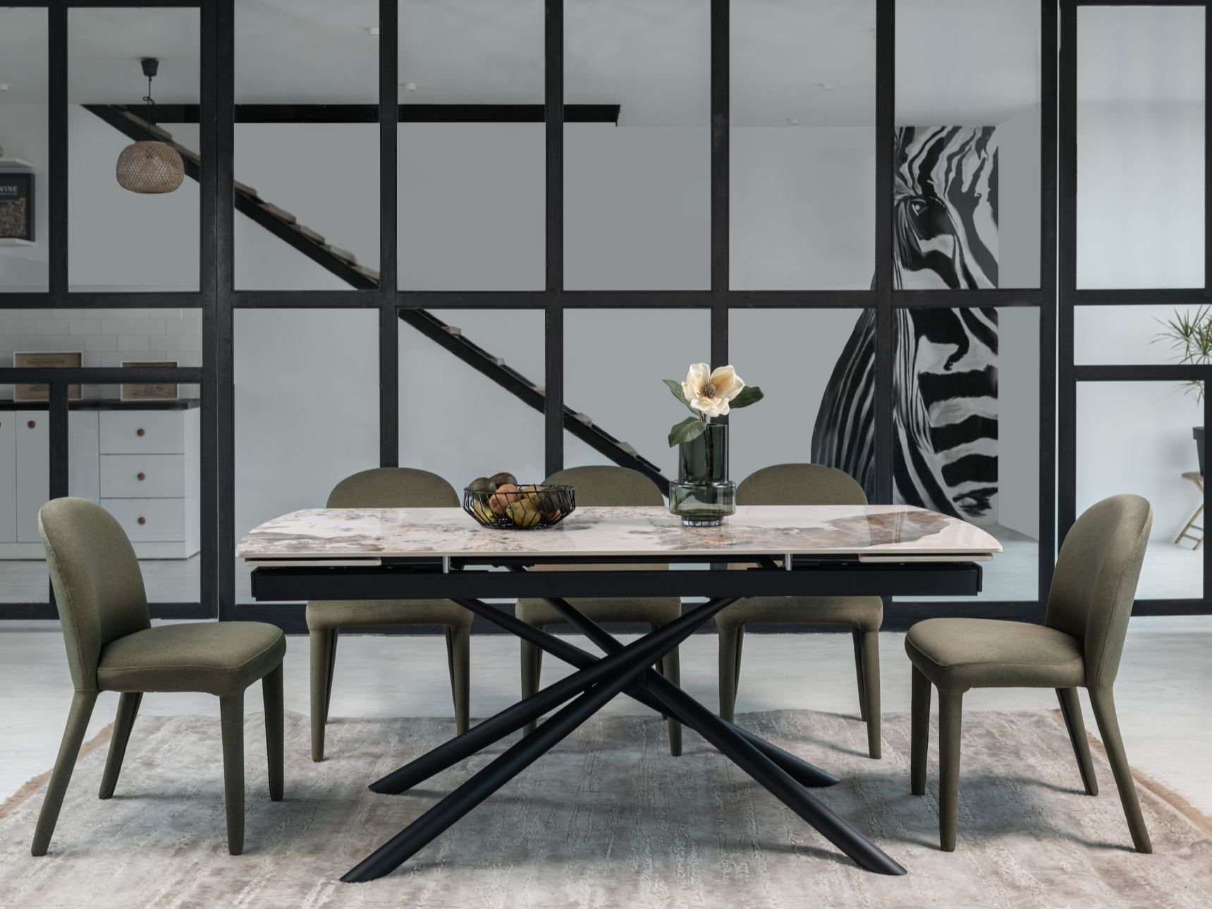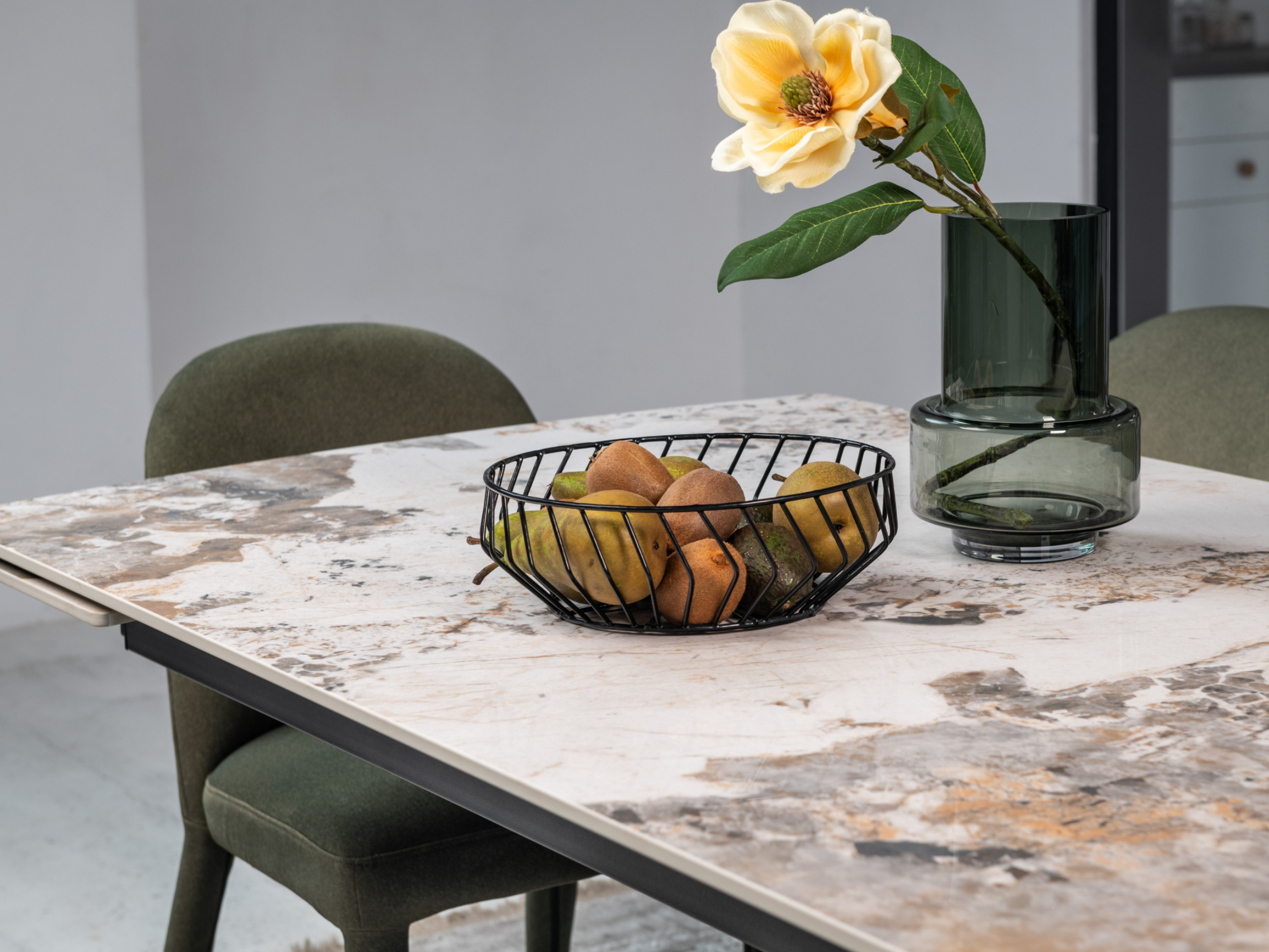 Кераміка в кольорі патагонія з природними прожилками виглядає розкішно та елегантно, а чорна металева основа додає контрасту, підкреслюючи сучасний стиль. Це поєднання створює враження витонченості та елегантності.