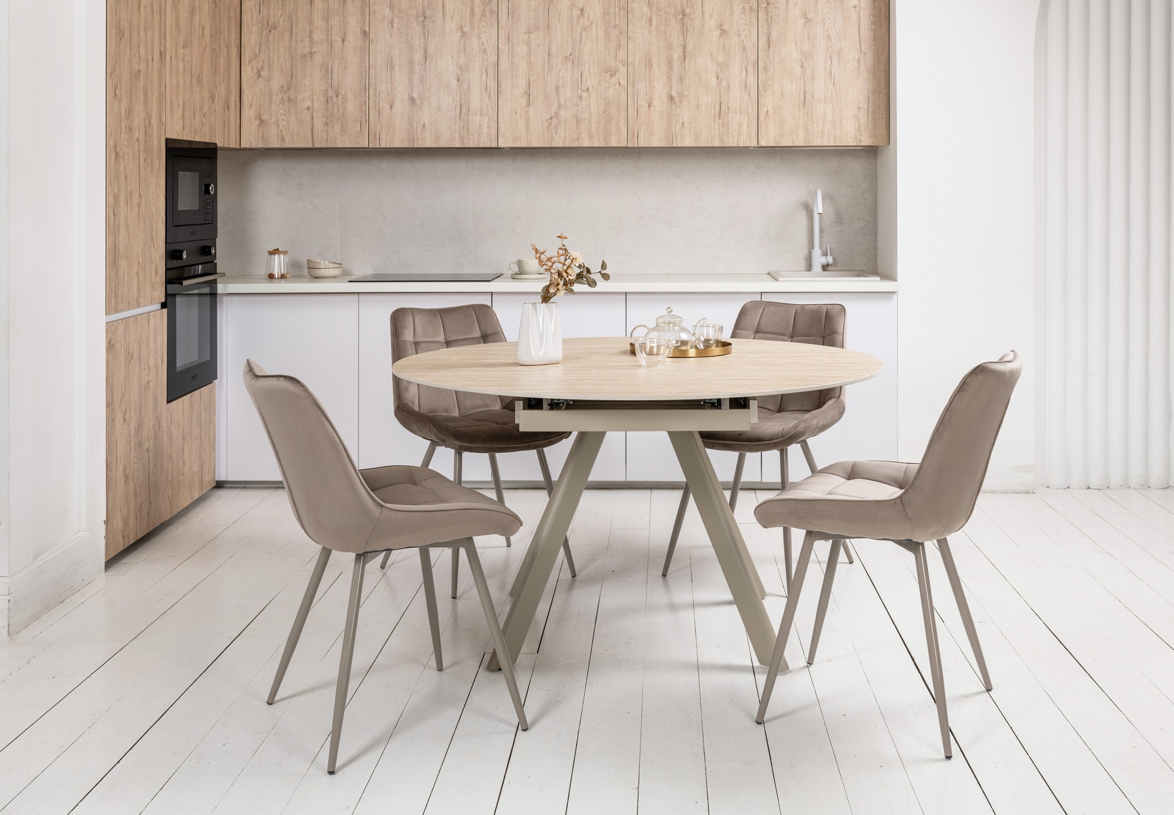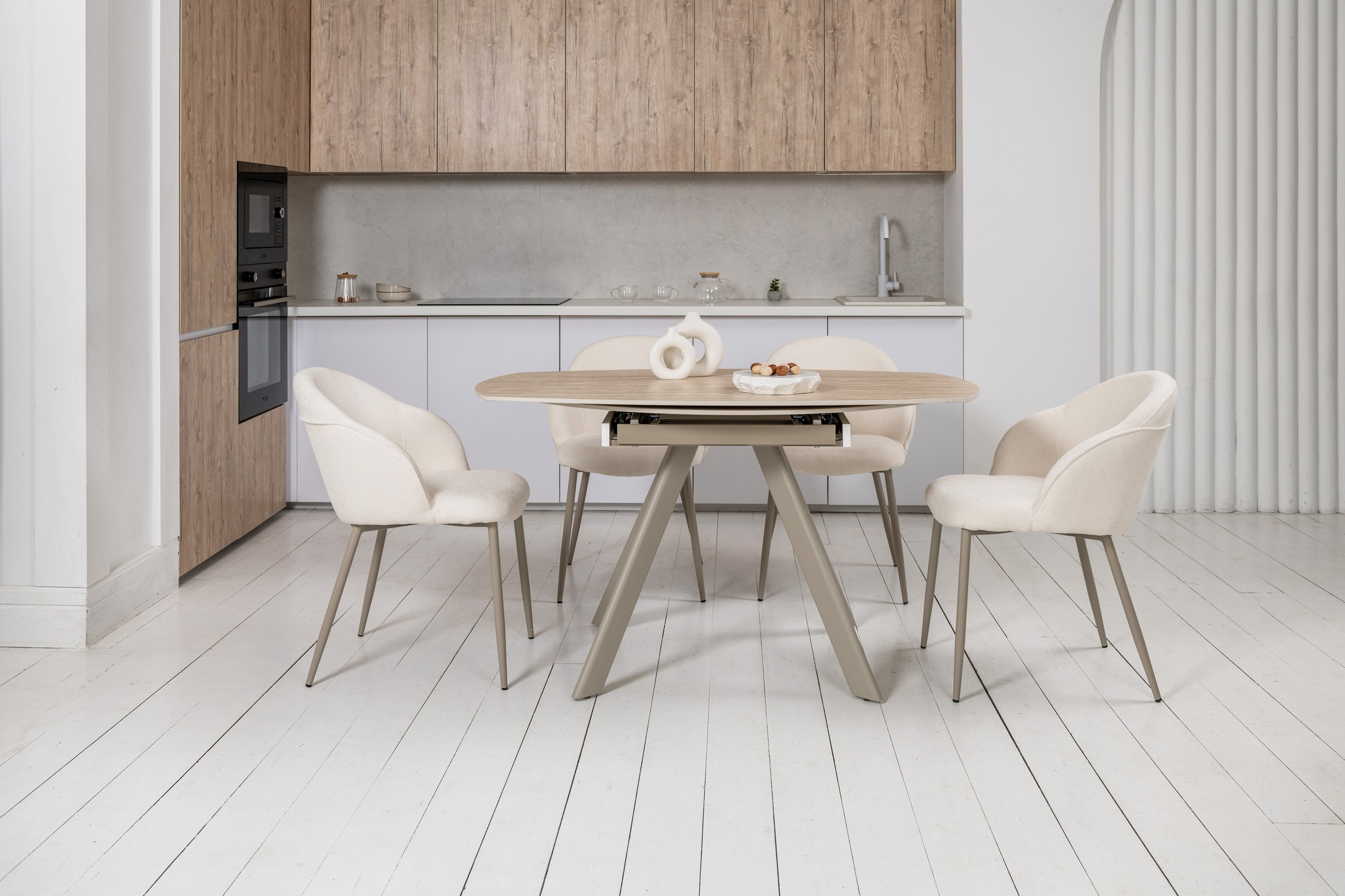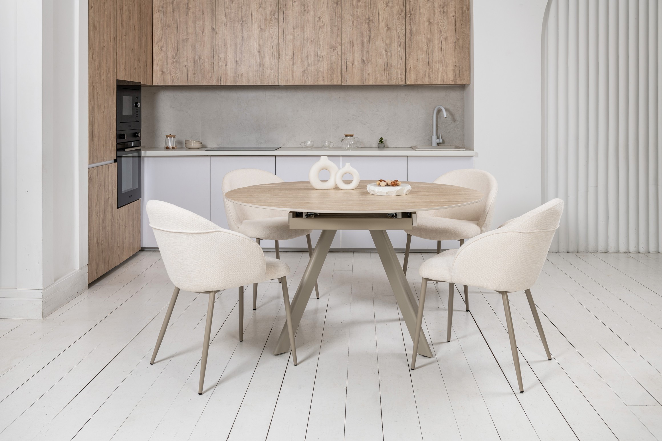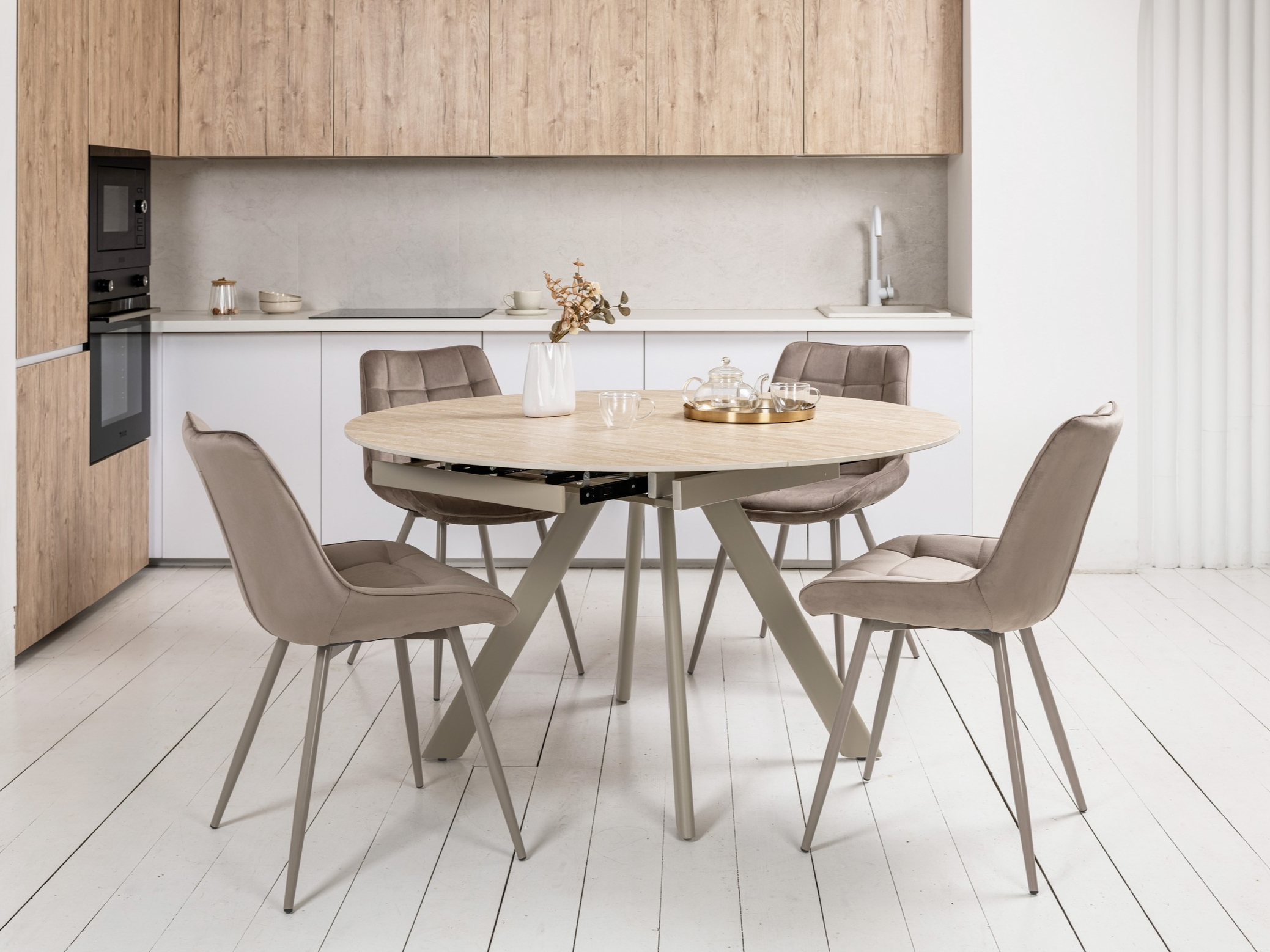 Стіл має круглу форму діаметром 135 см, що дозволяє комфортно розмістити сім’ю або гостей за обідом. Завдяки боковому механізму розкладки стіл легко трансформується, збільшуючи корисну площу для сервірування або проведення святкових подій. Оптимальна висота 76 см забезпечує зручність для людей будь-якого зросту, а міцні матеріали гарантують тривалий термін експлуатації навіть при щоденному використанні.