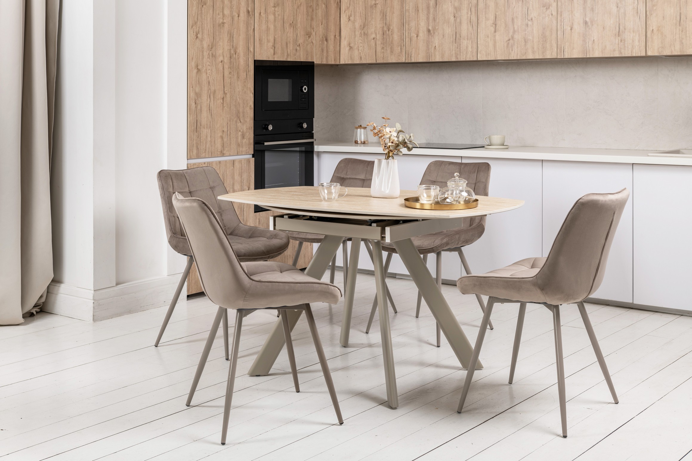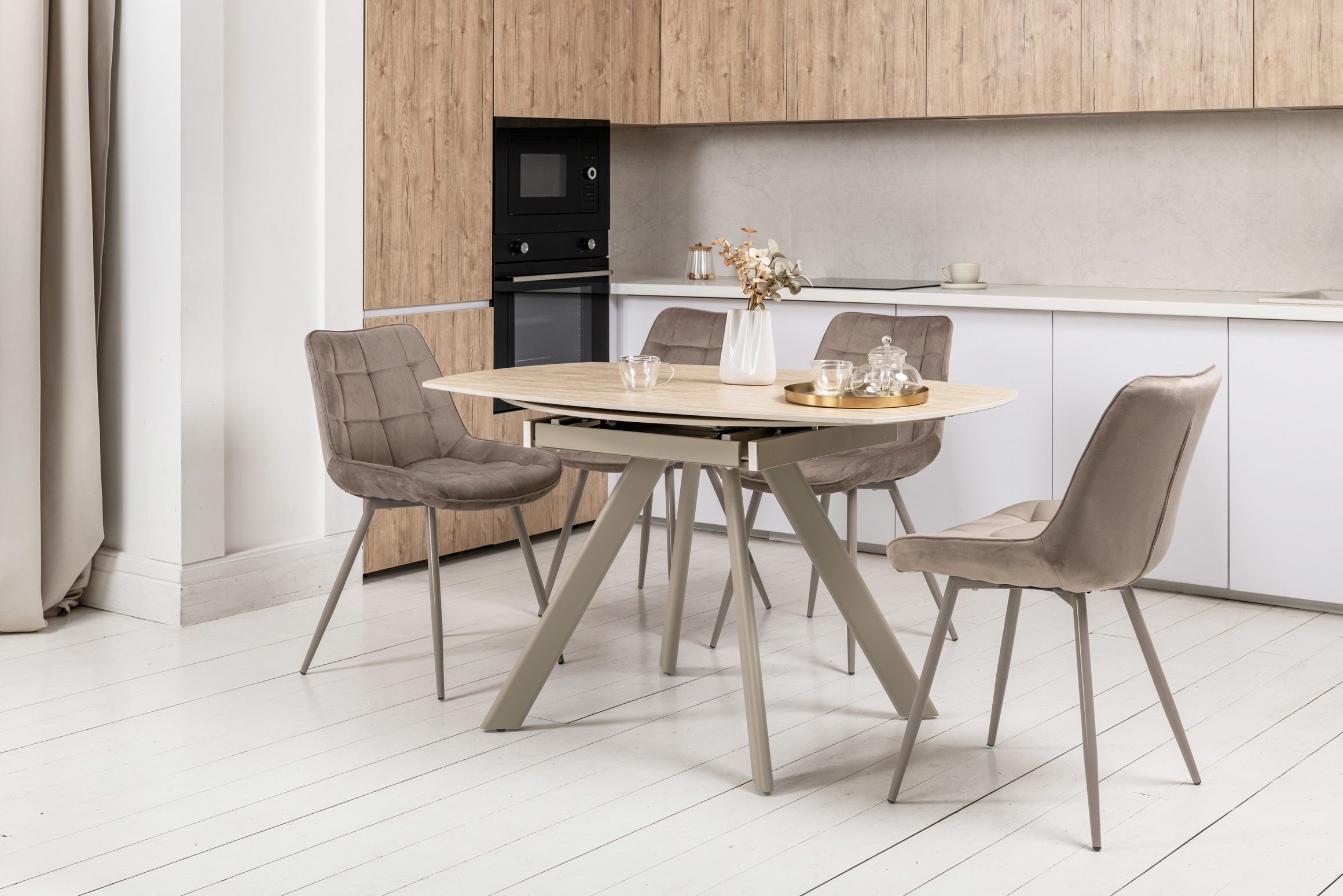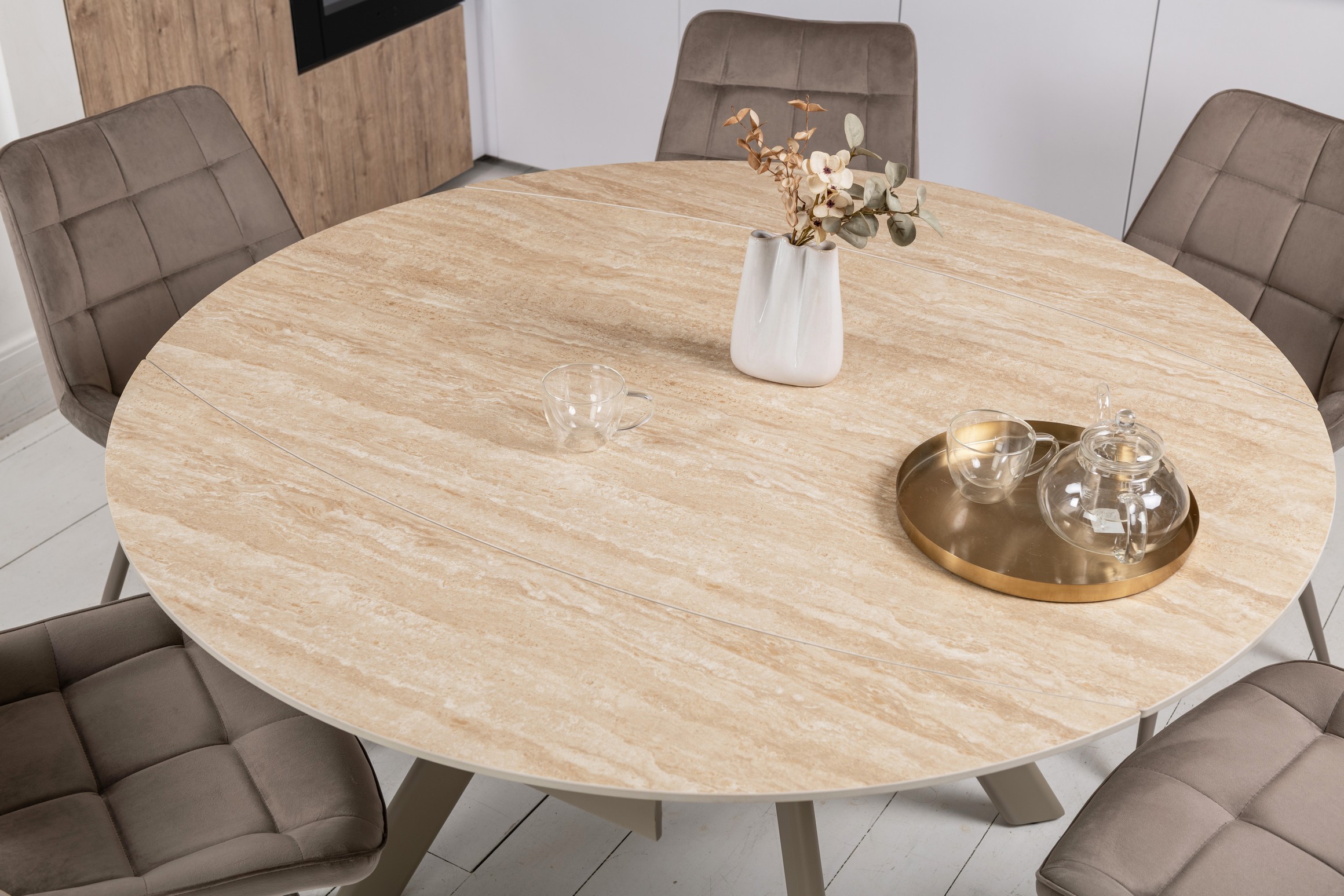 Сучасний керамічний стіл Сієна TML-1240 — це стильне рішення для вашої кухні чи вітальні, яке поєднує витончений дизайн, високу функціональність і міцність. Стільниця з матової кераміки в трендовому відтінку римський травертін додає інтер’єру розкоші та благородства, а фарбована металева основа кольору капучино забезпечує надійність і стійкість конструкції.