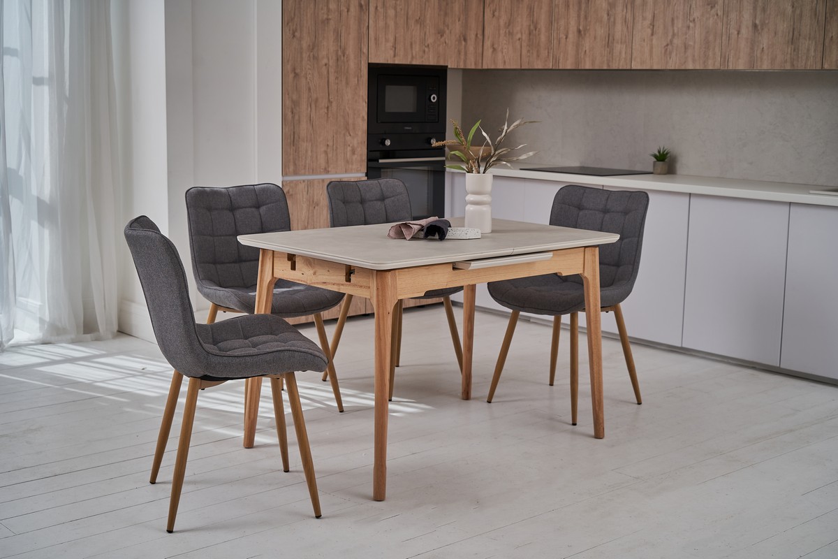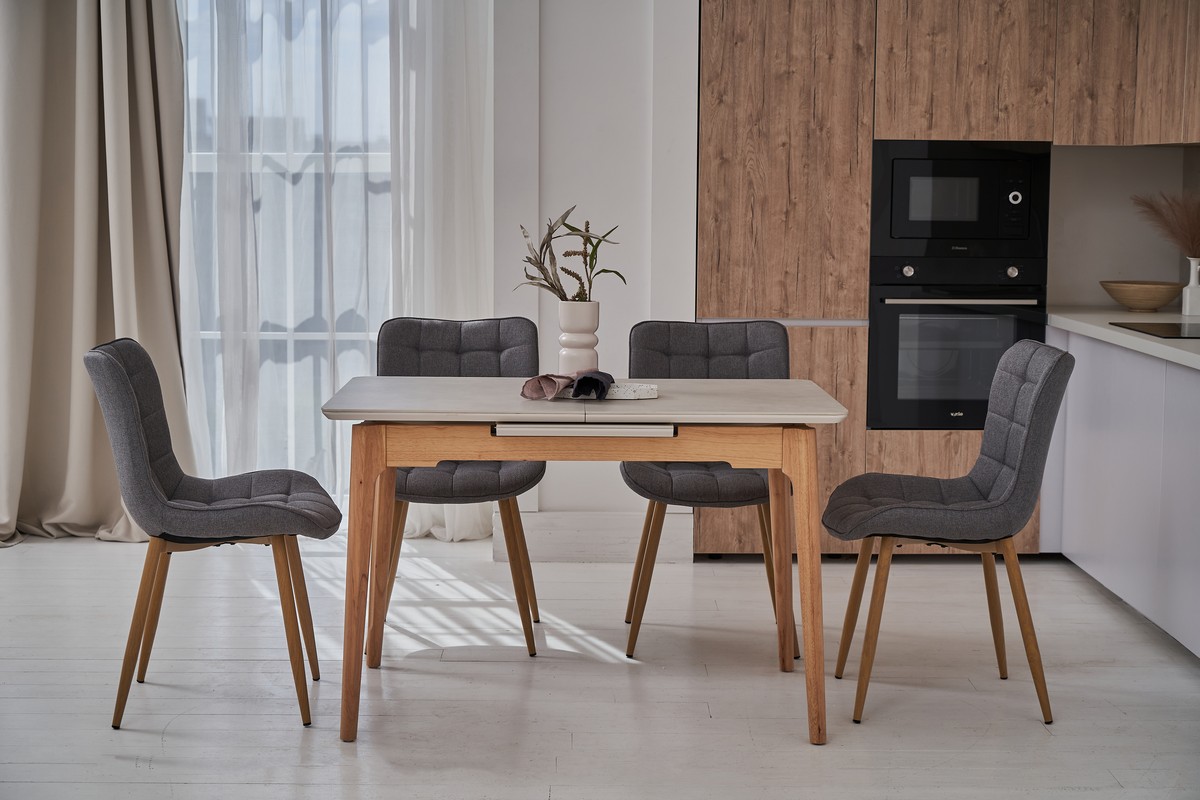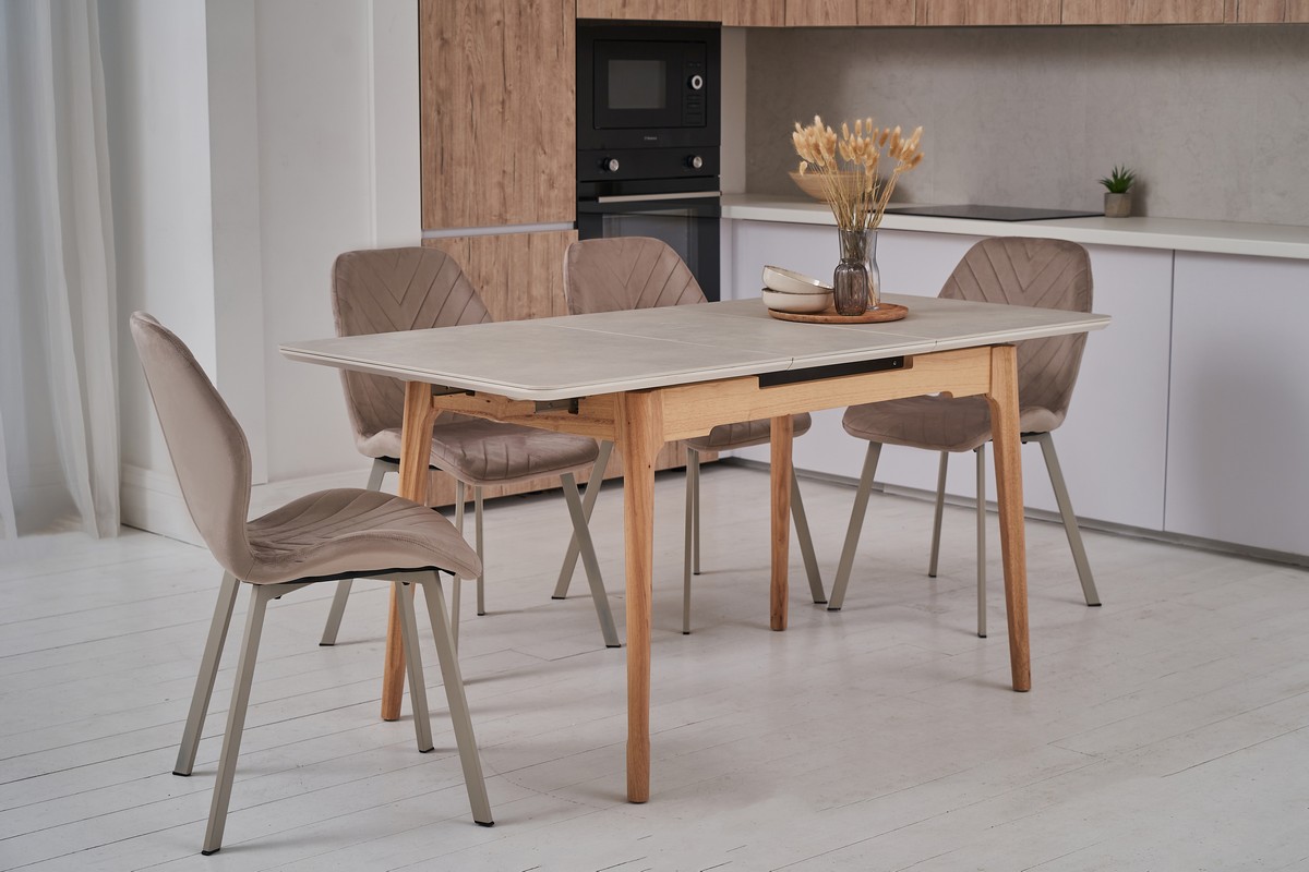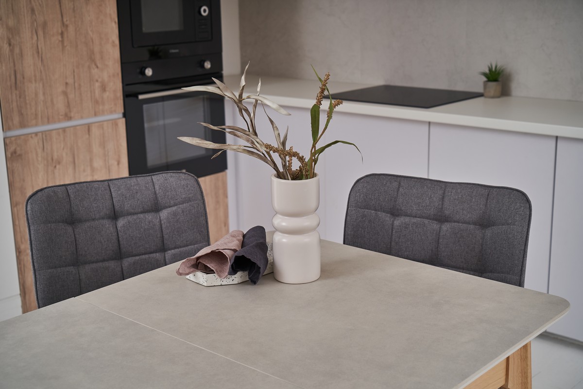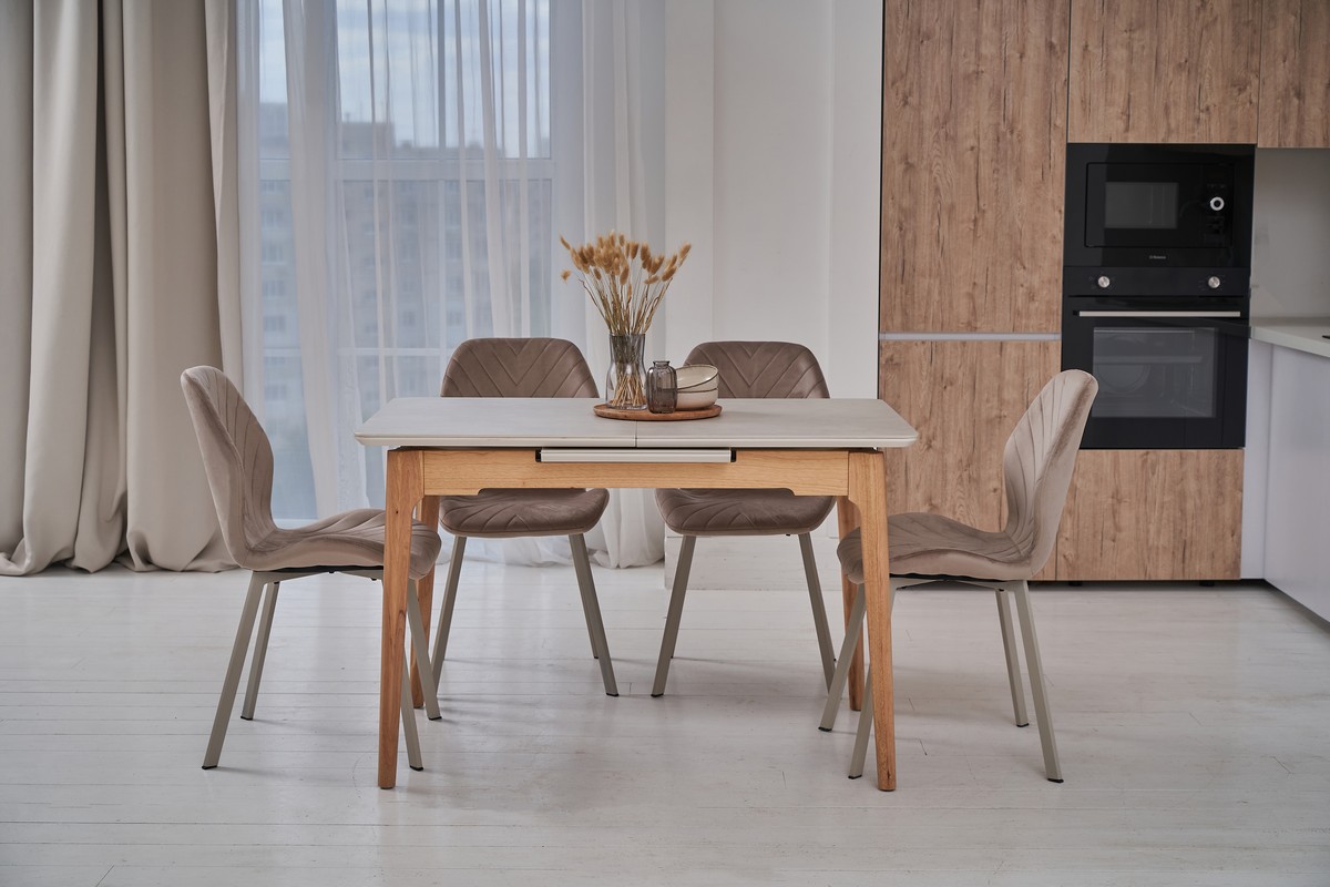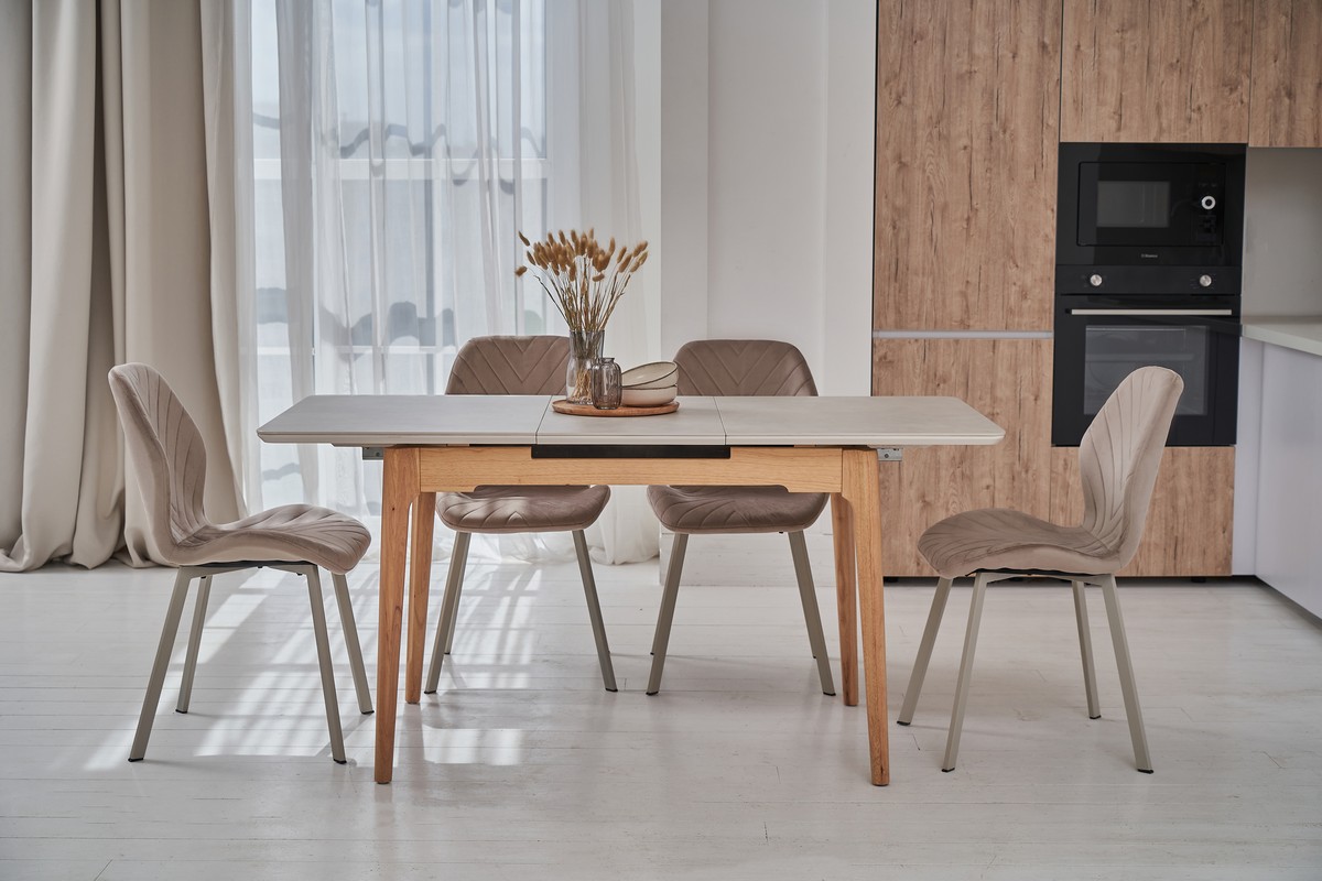 Столешня виготовлена з матової кераміки, що робить її міцною та стійкою до подряпин та впливу вологи. Керамічна стільниця надає столу сучасний вигляд і легко чиститься.
