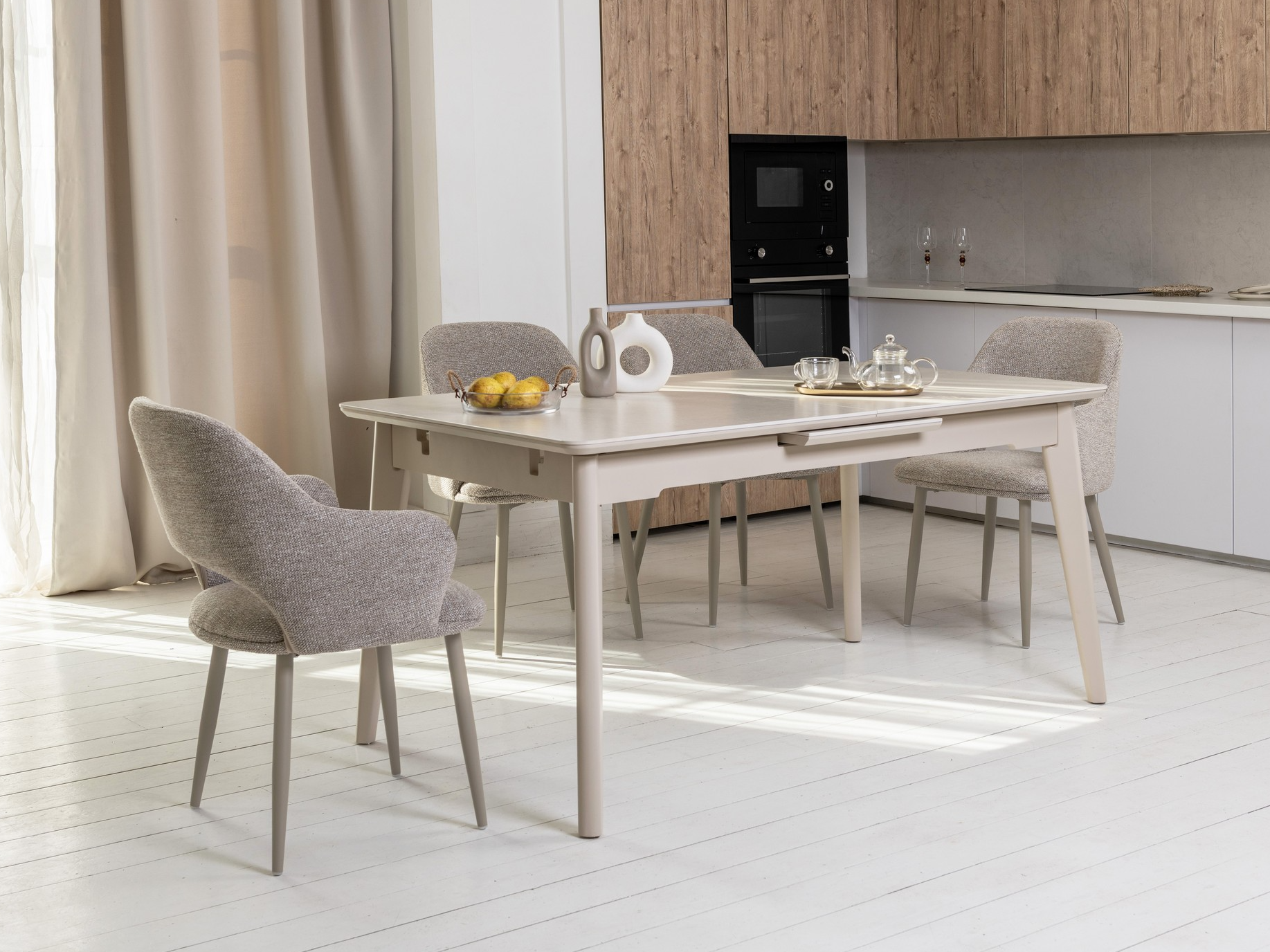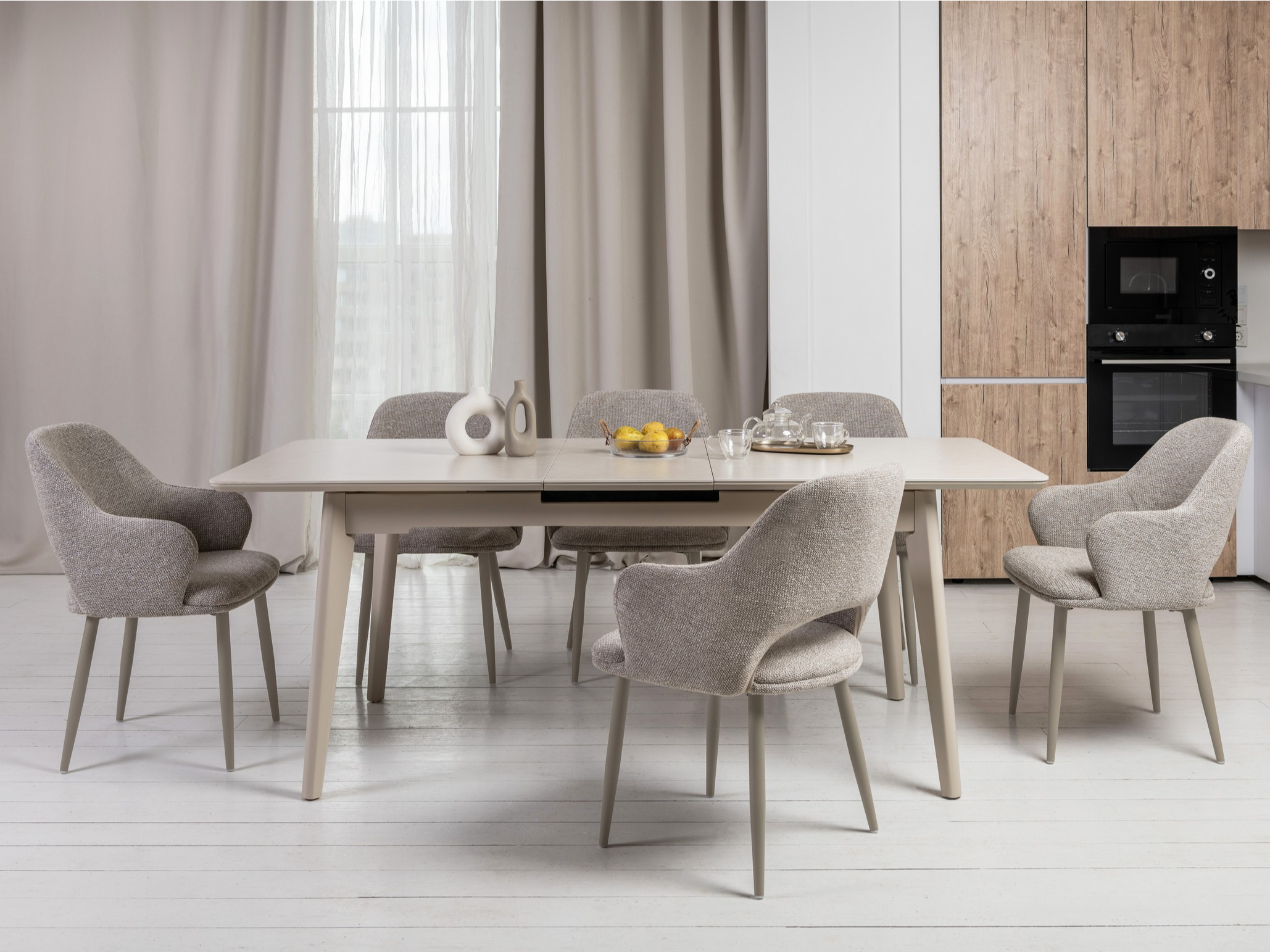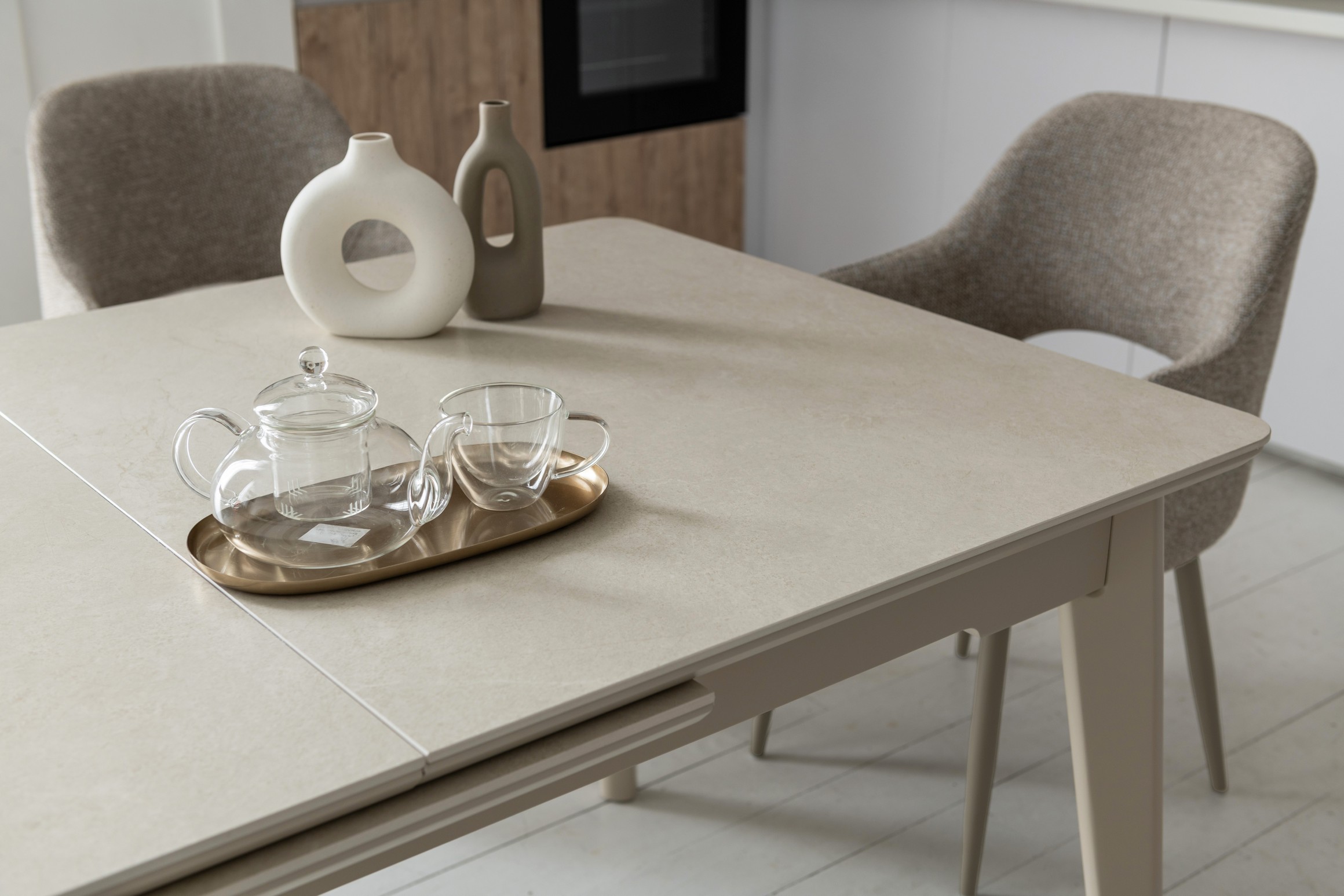 Поверхня виконана з матової кераміки та МДФ, що забезпечує стійкість до подряпин, плям і високих температур. Завдяки автоматичному механізму розкладки стіл легко збільшується з 160 до 200 см — ідеальне рішення для великих сімейних обідів або зустрічей із друзями.