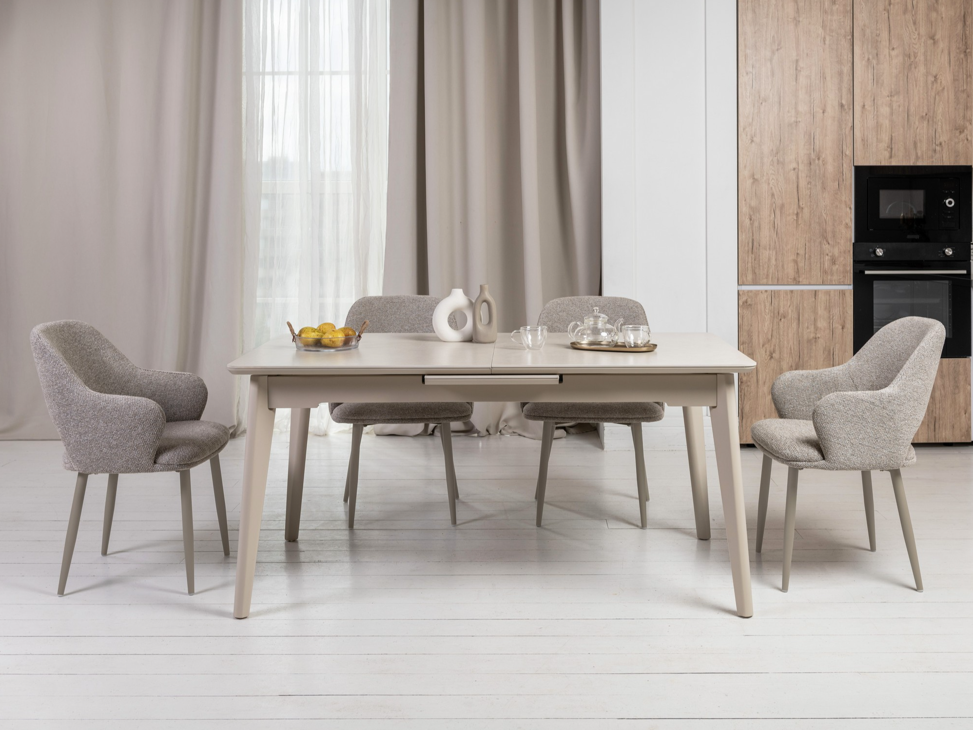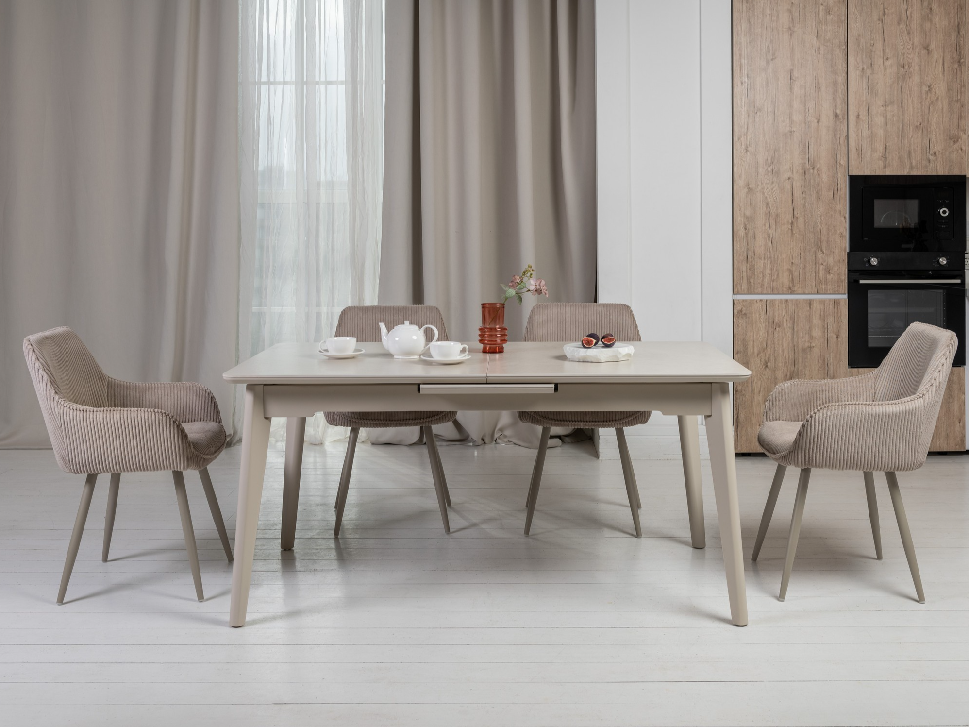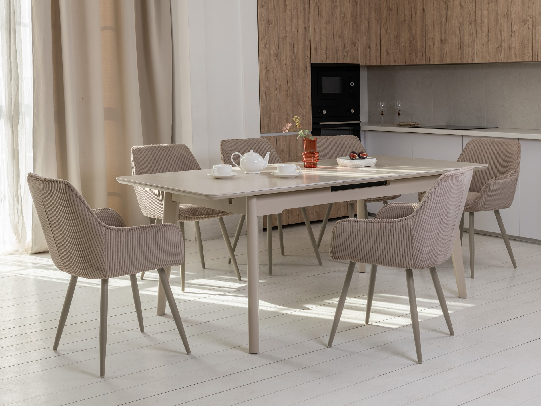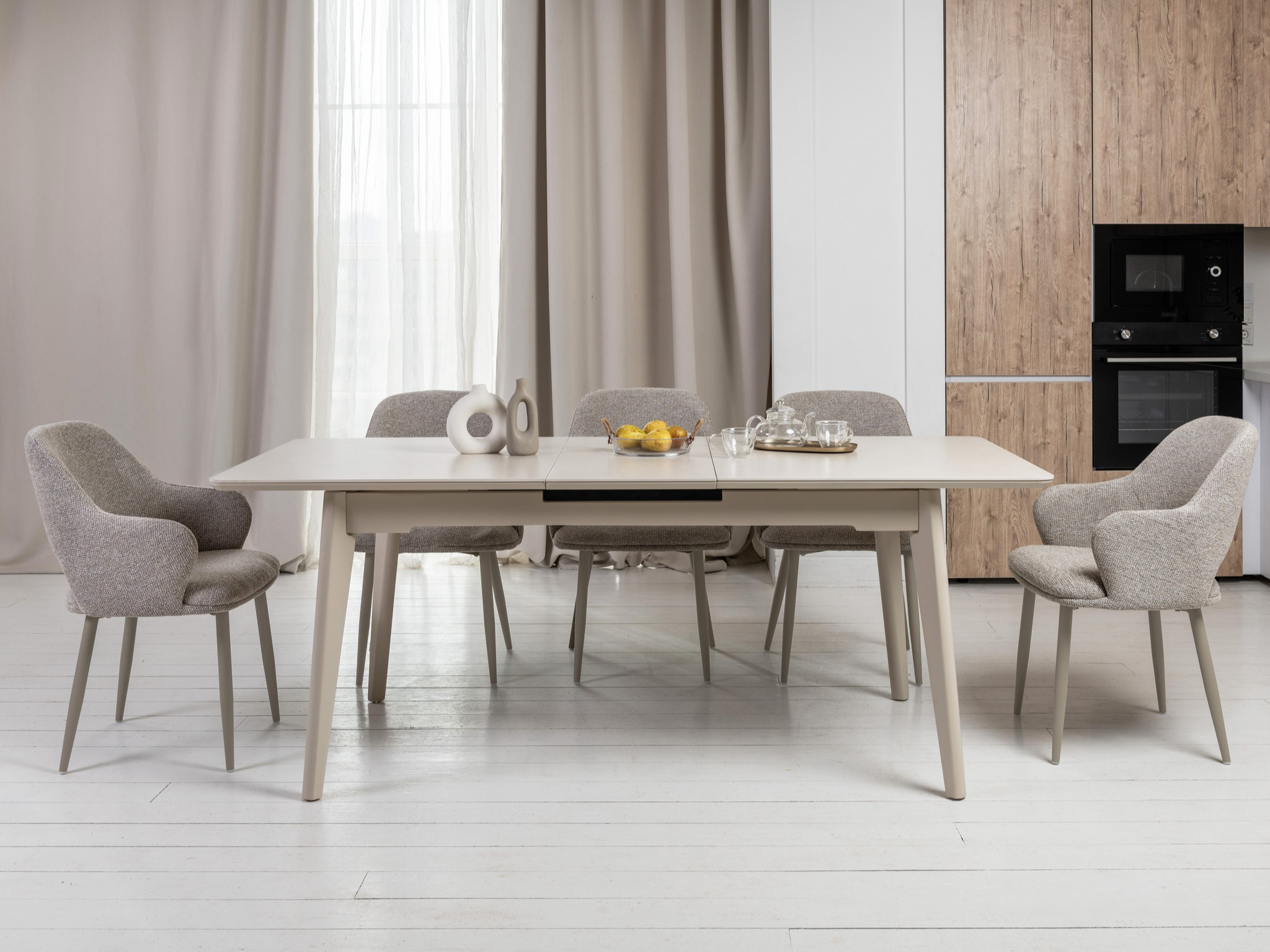 Поверхня виконана з матової кераміки та МДФ, що забезпечує стійкість до подряпин, плям і високих температур. Завдяки автоматичному механізму розкладки стіл легко збільшується з 160 до 200 см — ідеальне рішення для великих сімейних обідів або зустрічей із друзями.