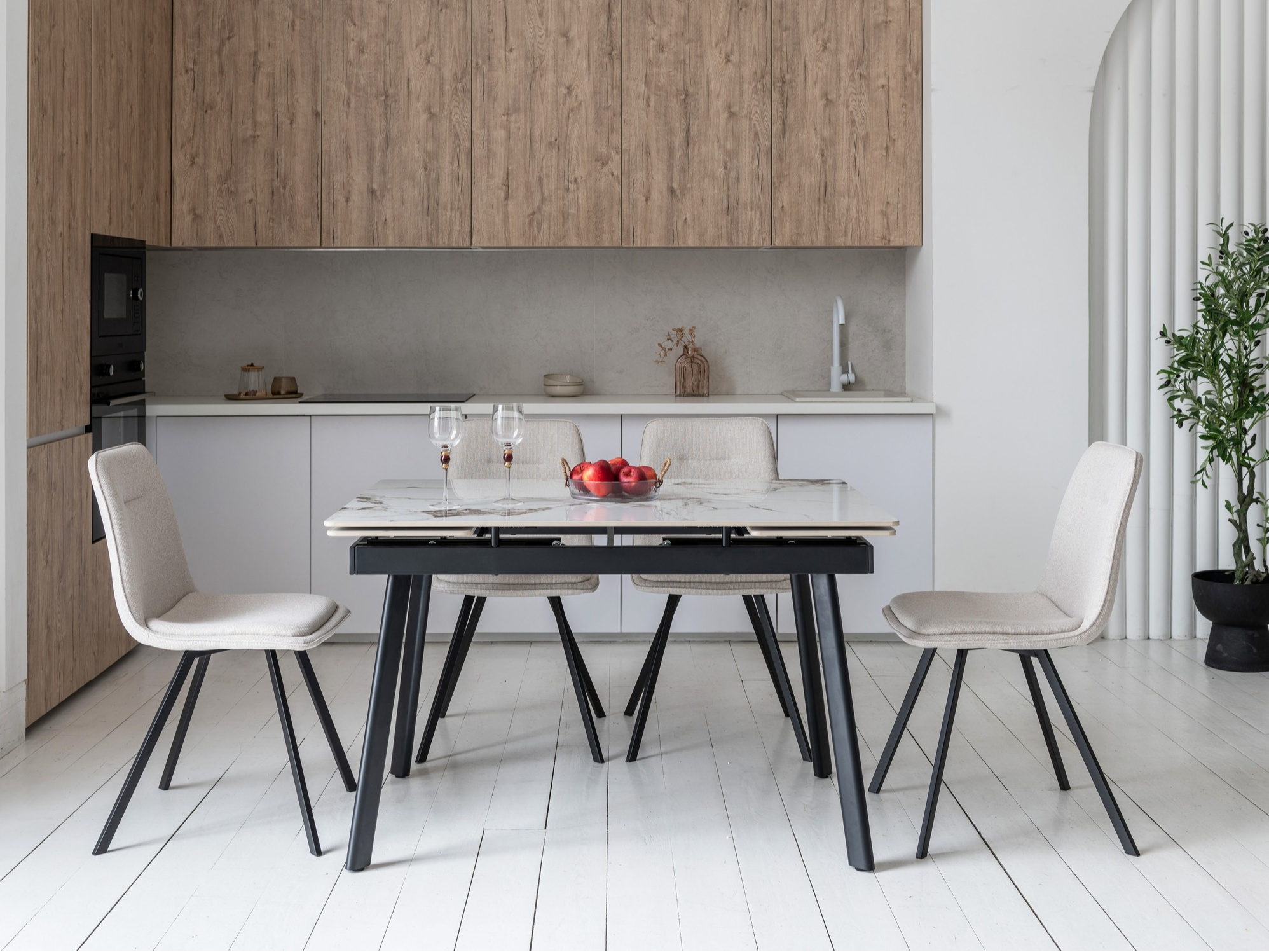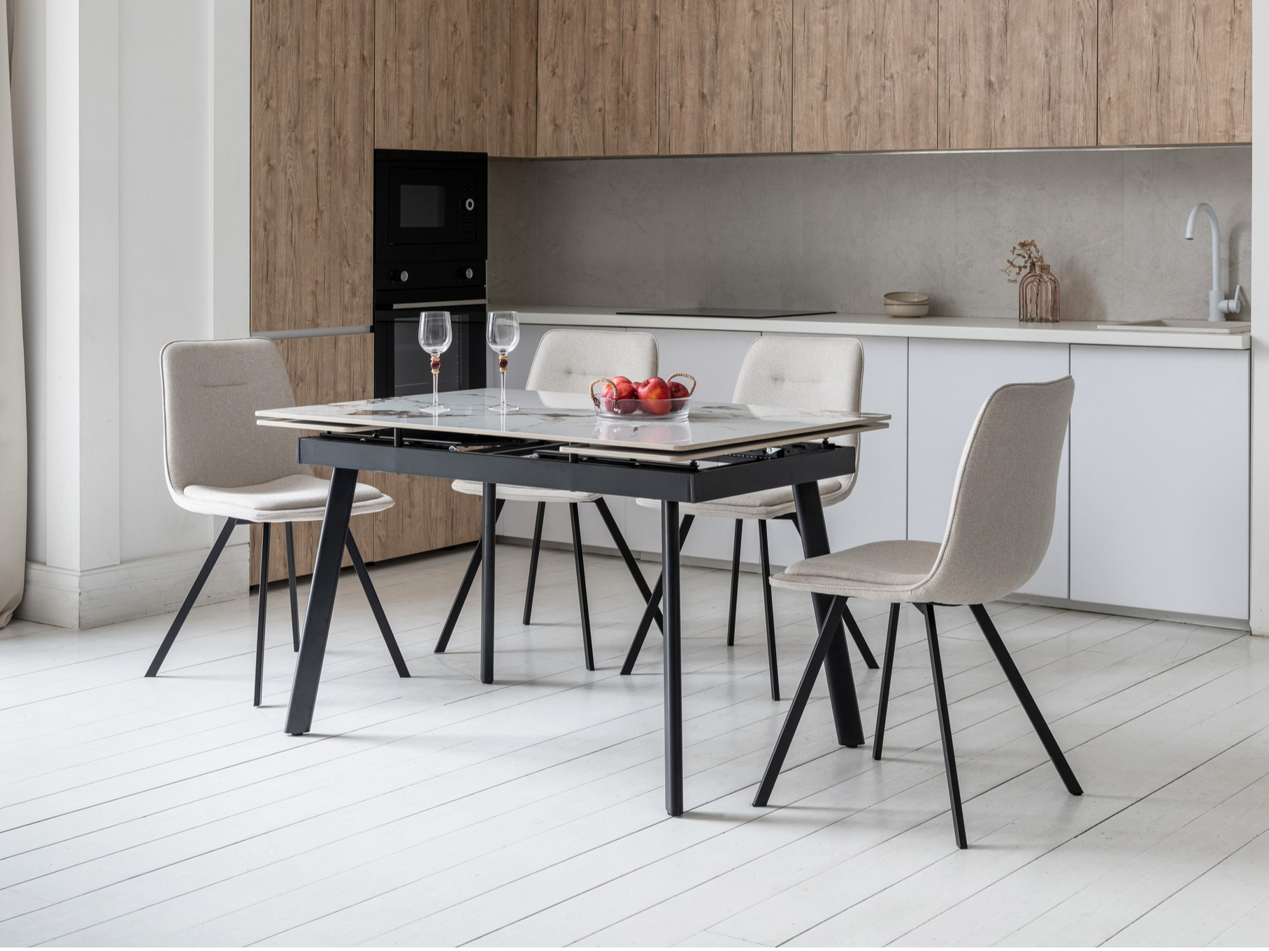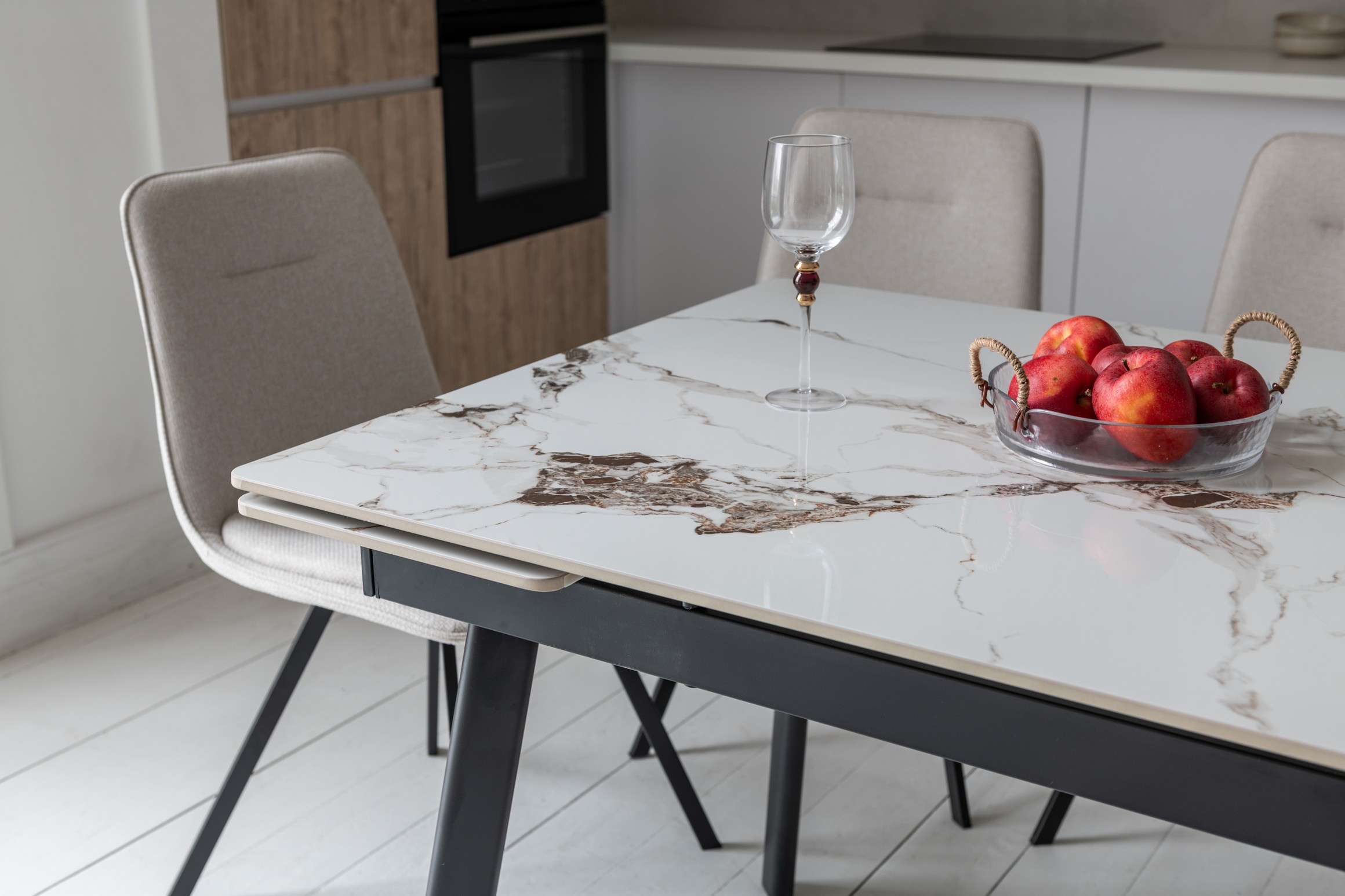Завдяки боковому механізму розкладання стіл легко збільшується з 120 до 180 см, забезпечуючи комфорт як у щоденному використанні, так і під час святкових зустрічей. Стільниця з глянцевої кераміки стійка до високих температур, а металева основа гарантує надійність та довговічність.