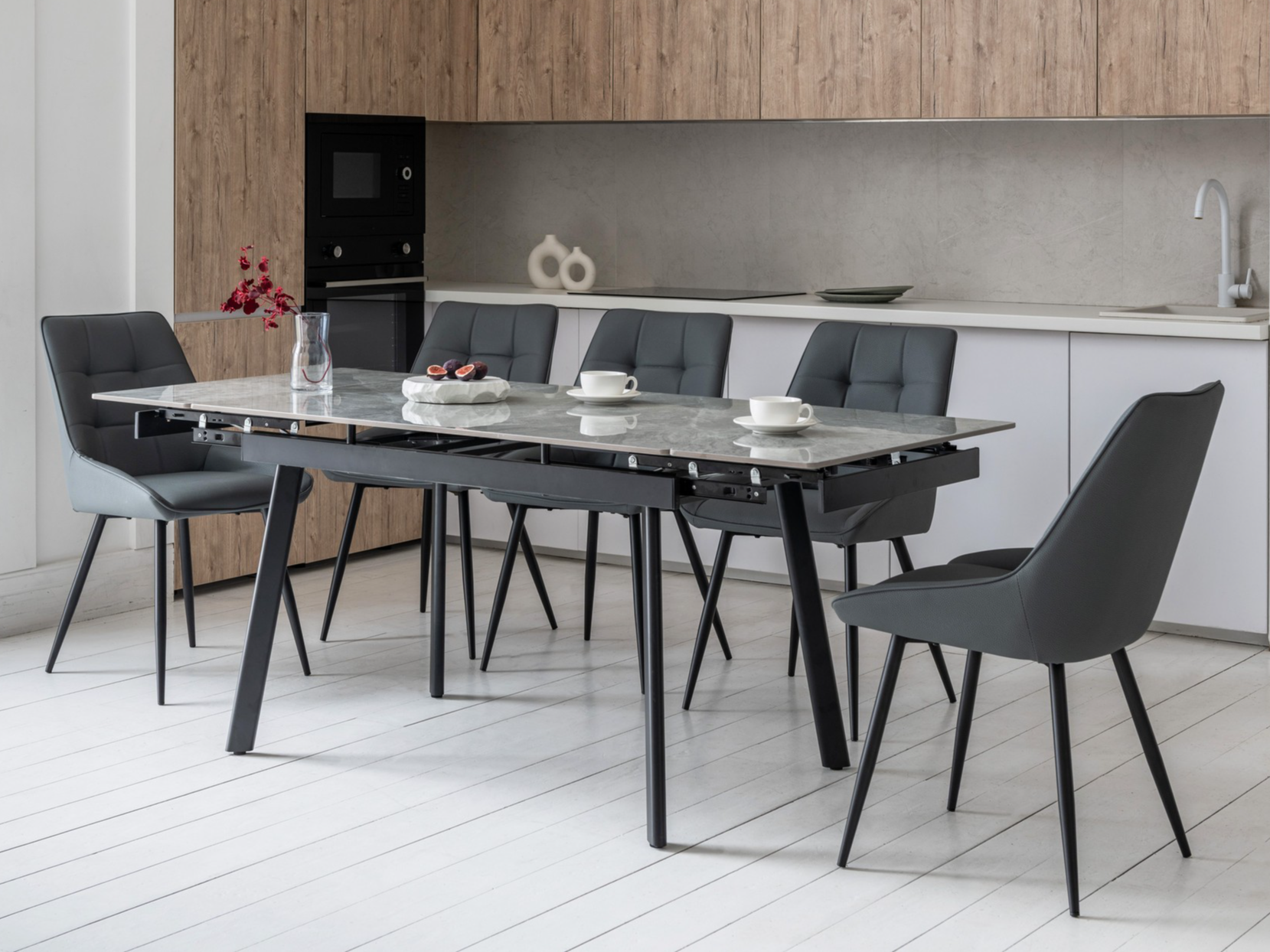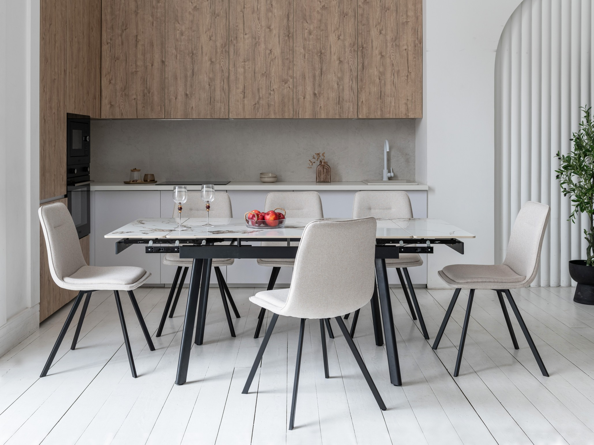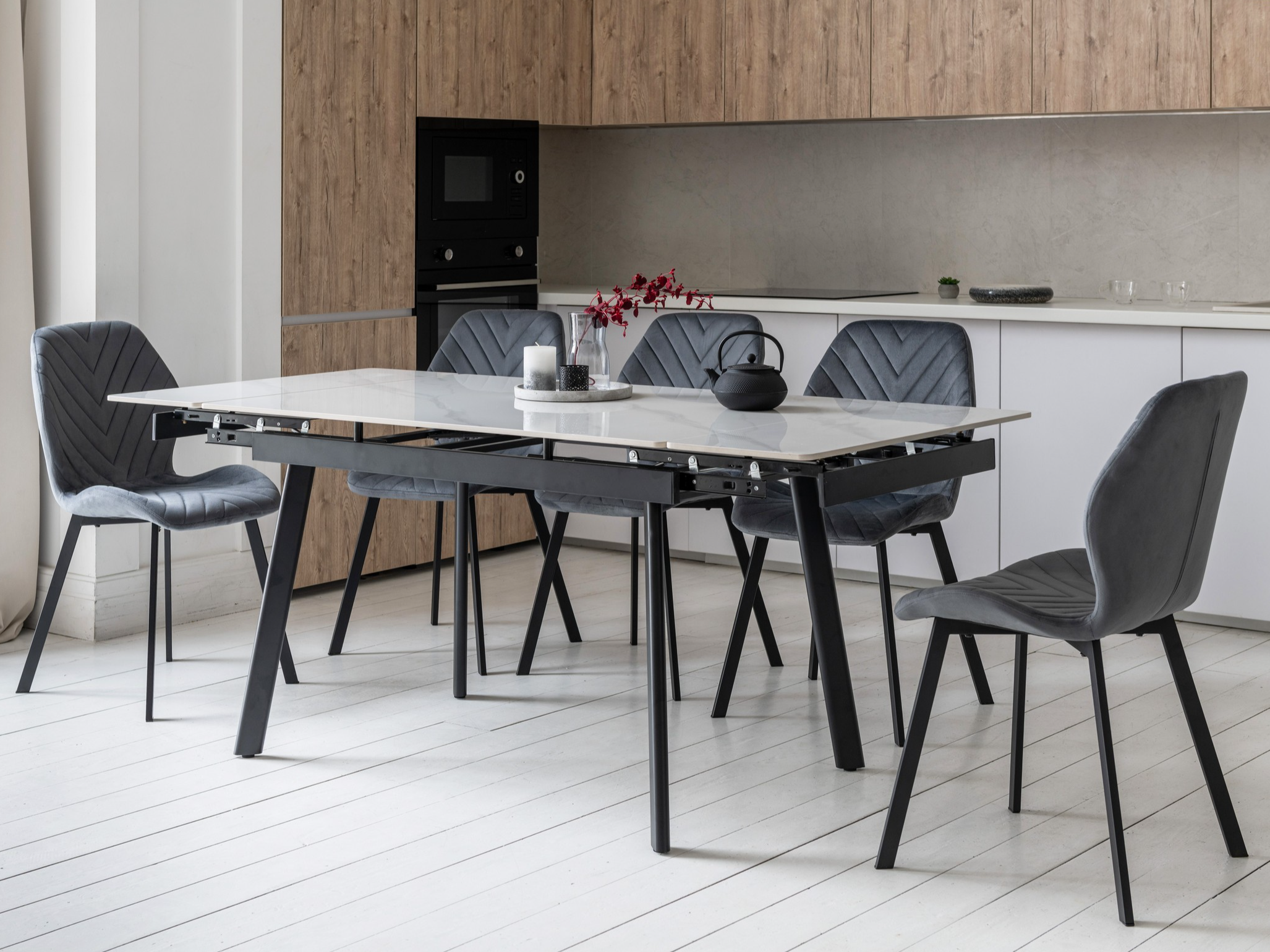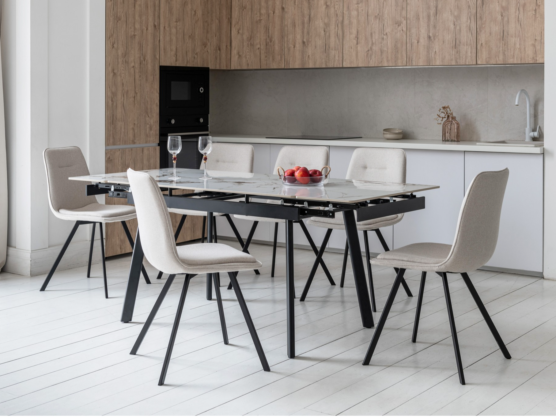 Завдяки боковому механізму розкладання стіл легко збільшується з 120 до 180 см, забезпечуючи комфорт як у щоденному використанні, так і під час святкових зустрічей. Стільниця з глянцевої кераміки стійка до високих температур, а металева основа гарантує надійність та довговічність.