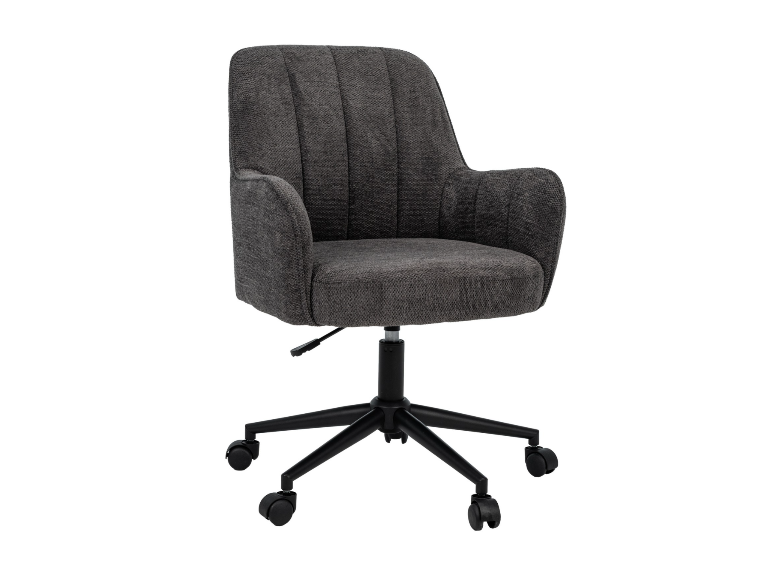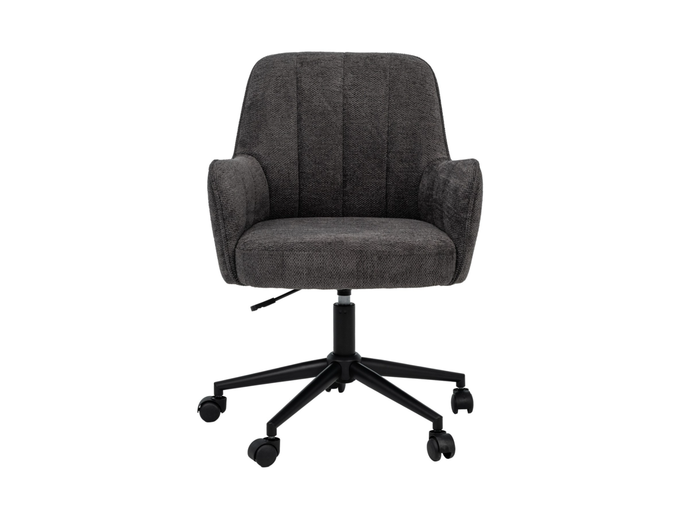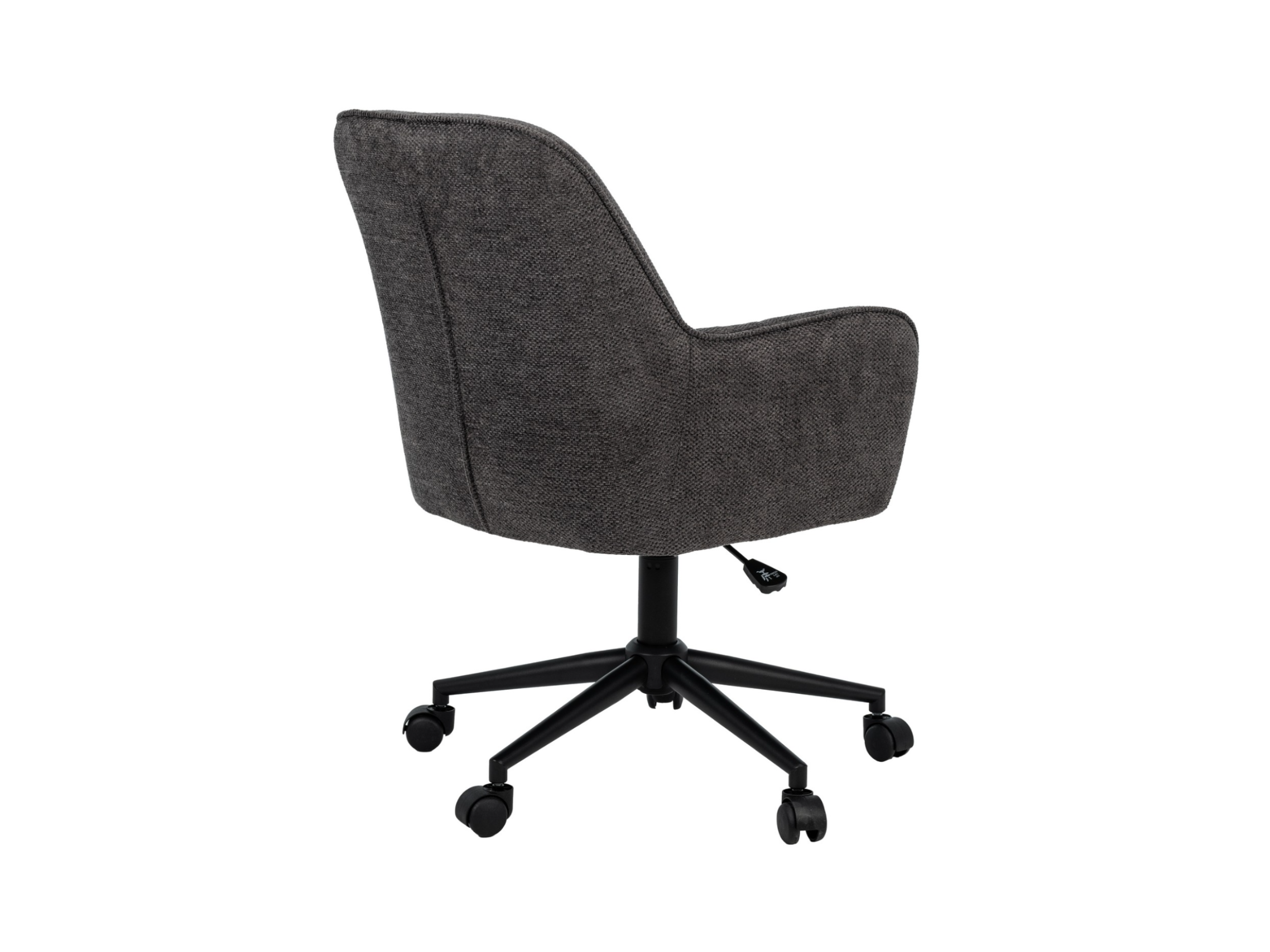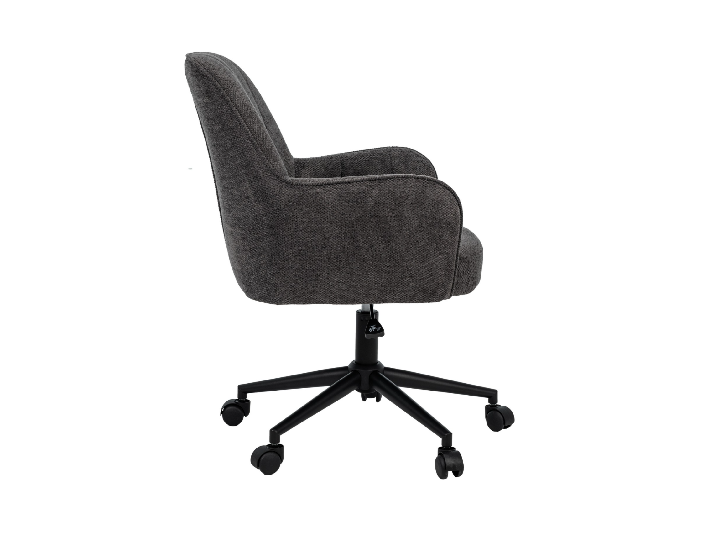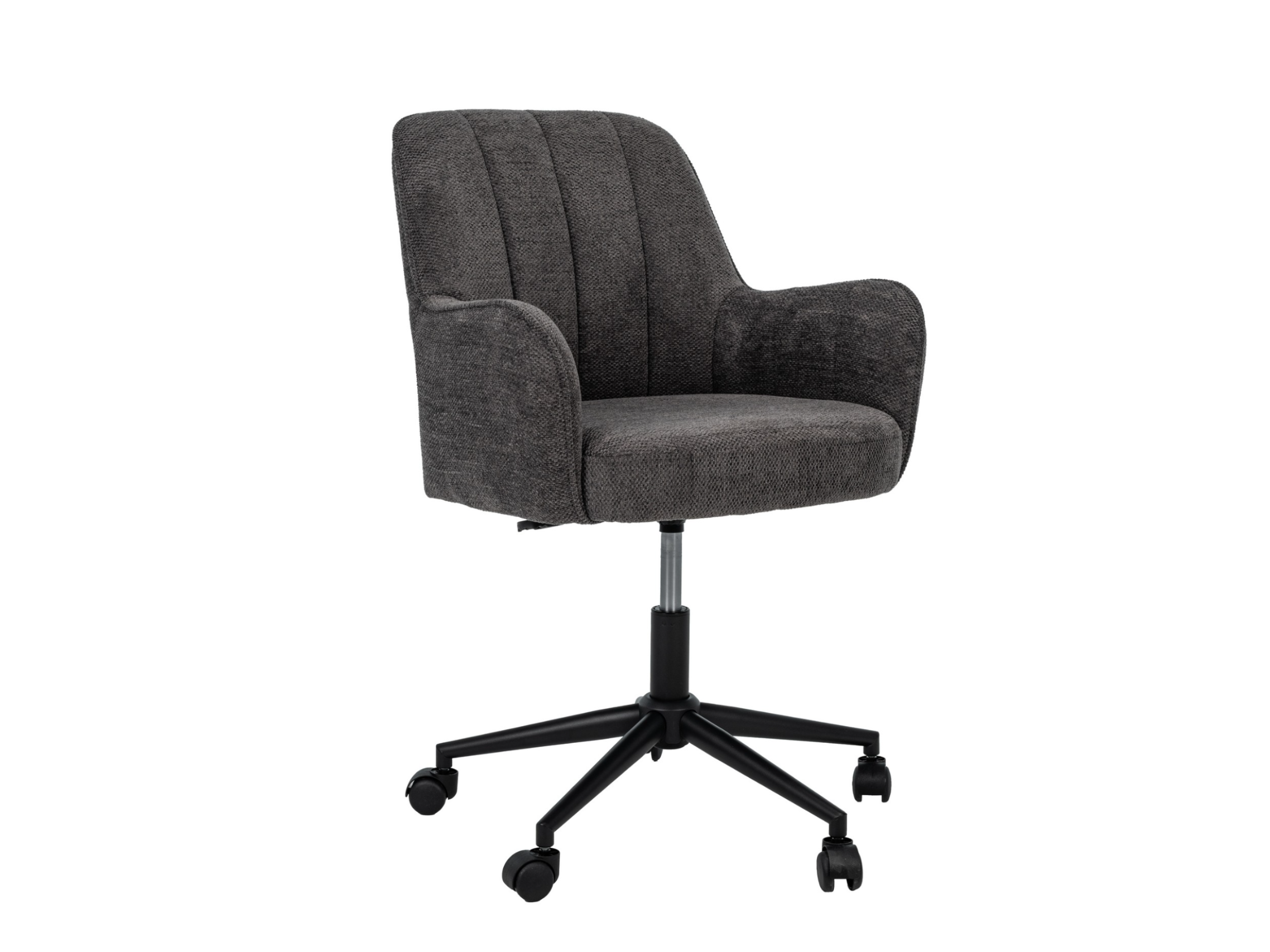 Оббивка з м’якого шенілу у відтінку темний графіт має приємну на дотик фактуру та вирізняється зносостійкістю, зберігаючи елегантний вигляд навіть після тривалого використання. Ергономічна форма спинки забезпечує підтримку хребта, а м’яке сидіння сприяє комфортному положенню тіла протягом робочого дня.