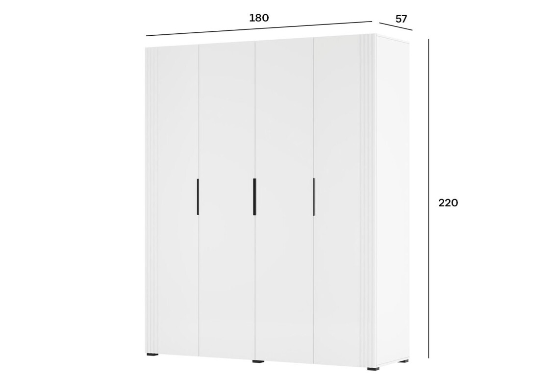 • Розмір: ширина 180 см, висота 220 см, глибина 57 см – оптимальні габарити для зберігання великої кількості речей без зайвого навантаження на простір.