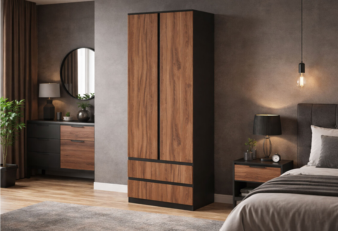 Шафа Світ Меблів Фріда дводверна з 2 шухлядами – це ідеальний вибір для тих, хто цінує поєднання сучасного дизайну, функціональності та надійності. Завдяки своїм компактним розмірам (ширина 80 см, висота 210,5 см, глибина 52 см) вона легко впишеться в будь-який інтер'єр, не займаючи багато місця. Чорний колір у поєднанні з дубом ліворно додає елегантності, а якісні матеріали, з яких виготовлена шафа, гарантують її довговічність. Фурнітура з телескопічними напрямними повного висуву забезпечує зручний доступ до вмісту шухляд, що робить використання шафи ще більш комфортним.