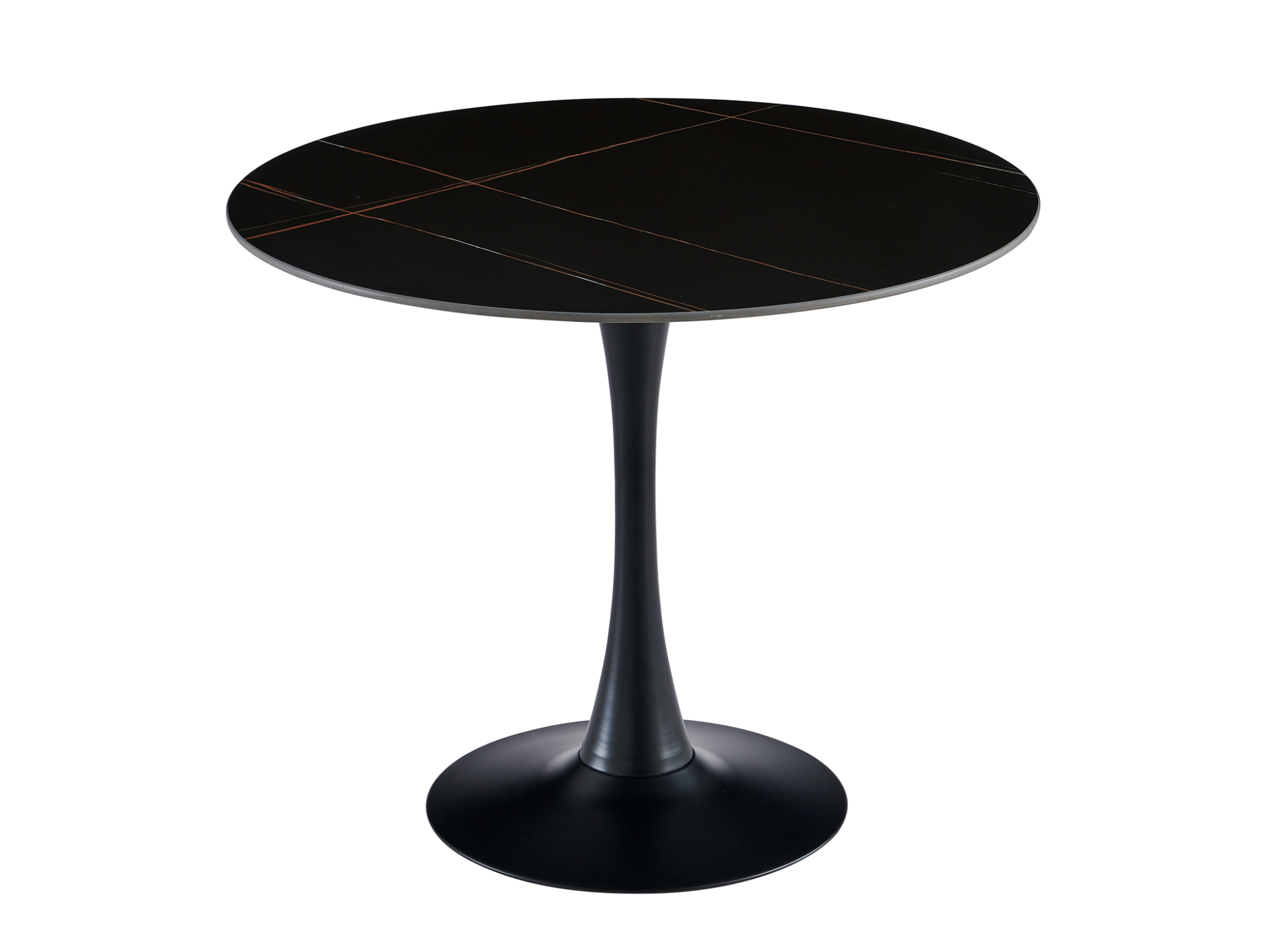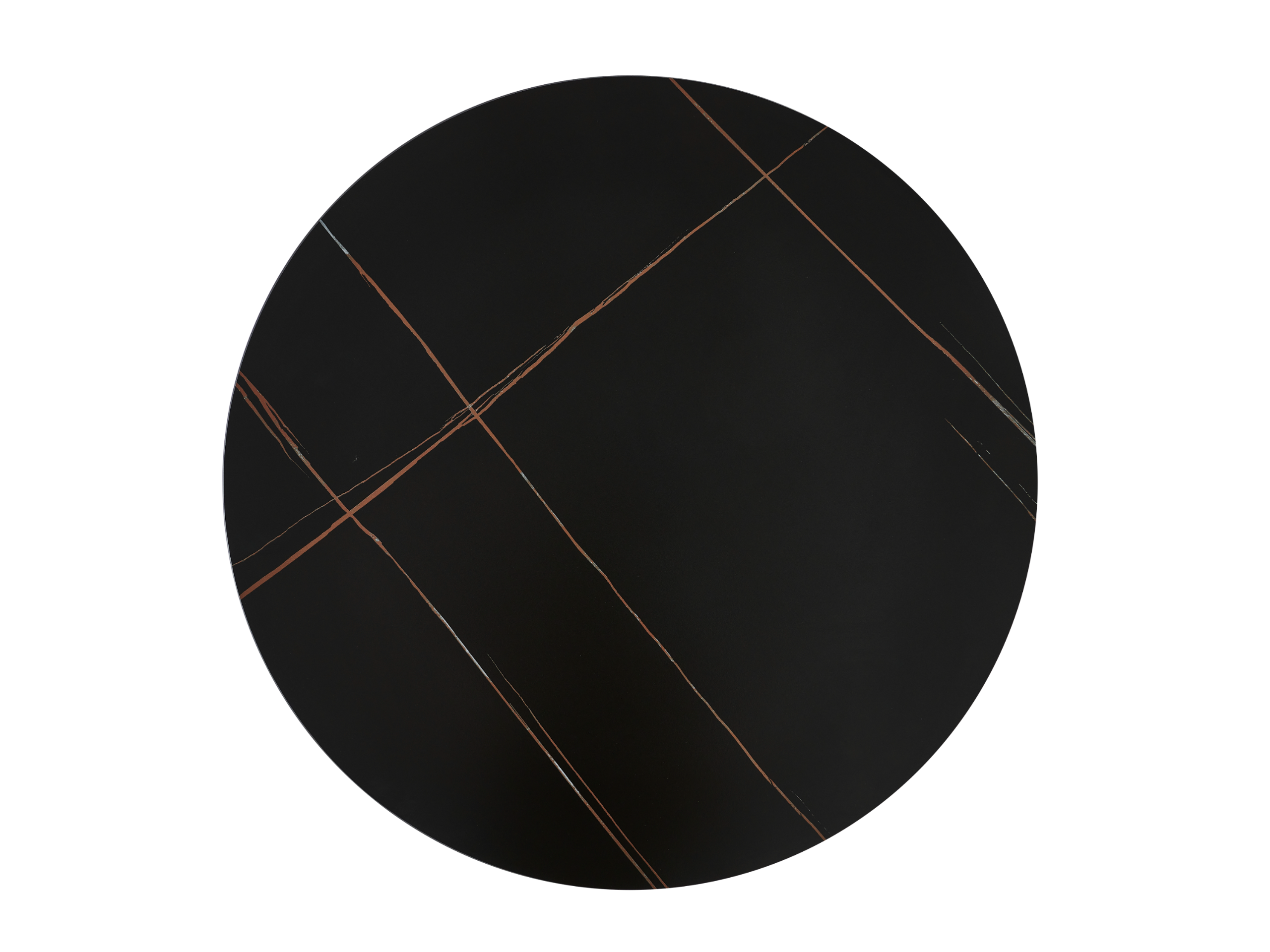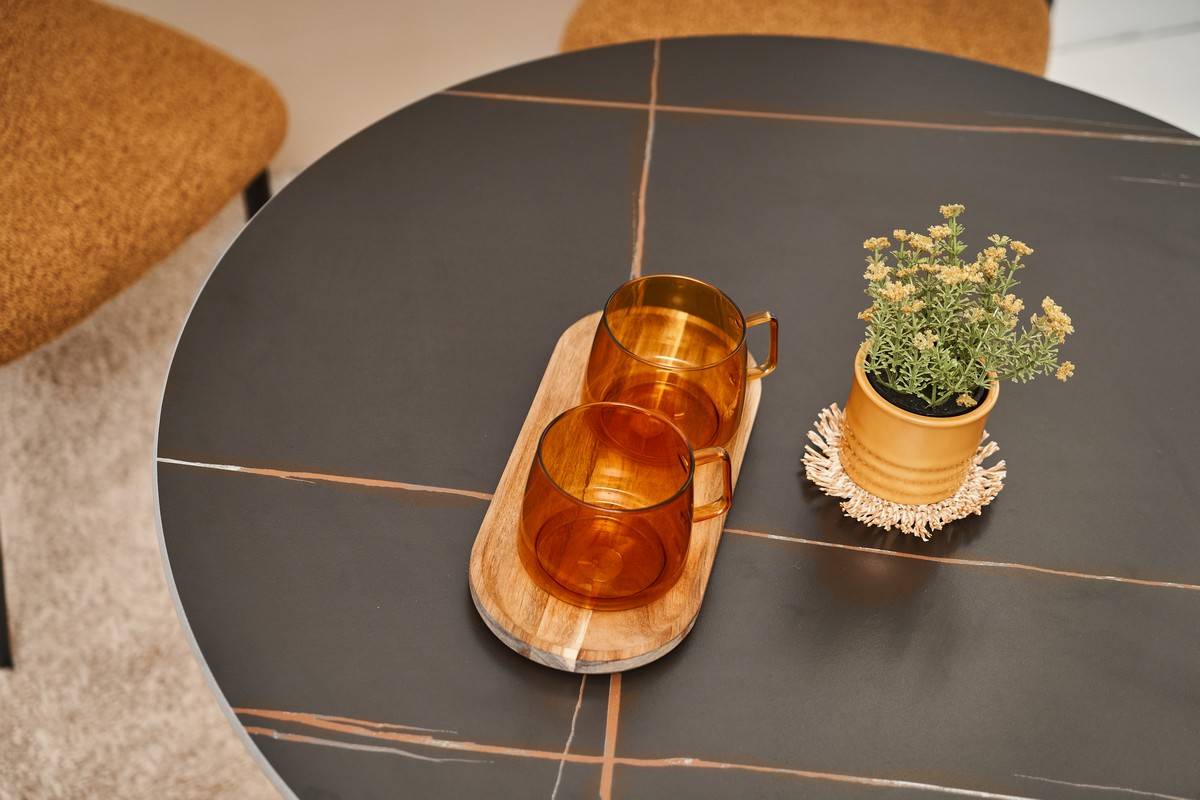 Стільниця виконана з матової кераміки в кольорі Лоран Блек, який імітує розкішний чорний мармур із глибокими прожилками. Такий відтінок надає столу вишуканий і стильний вигляд, що додає інтер’єру нотку розкоші. Матова поверхня стільниці не відбиває світло, що створює приємну атмосферу та зменшує видимість відбитків пальців і плям, полегшуючи догляд за столом.