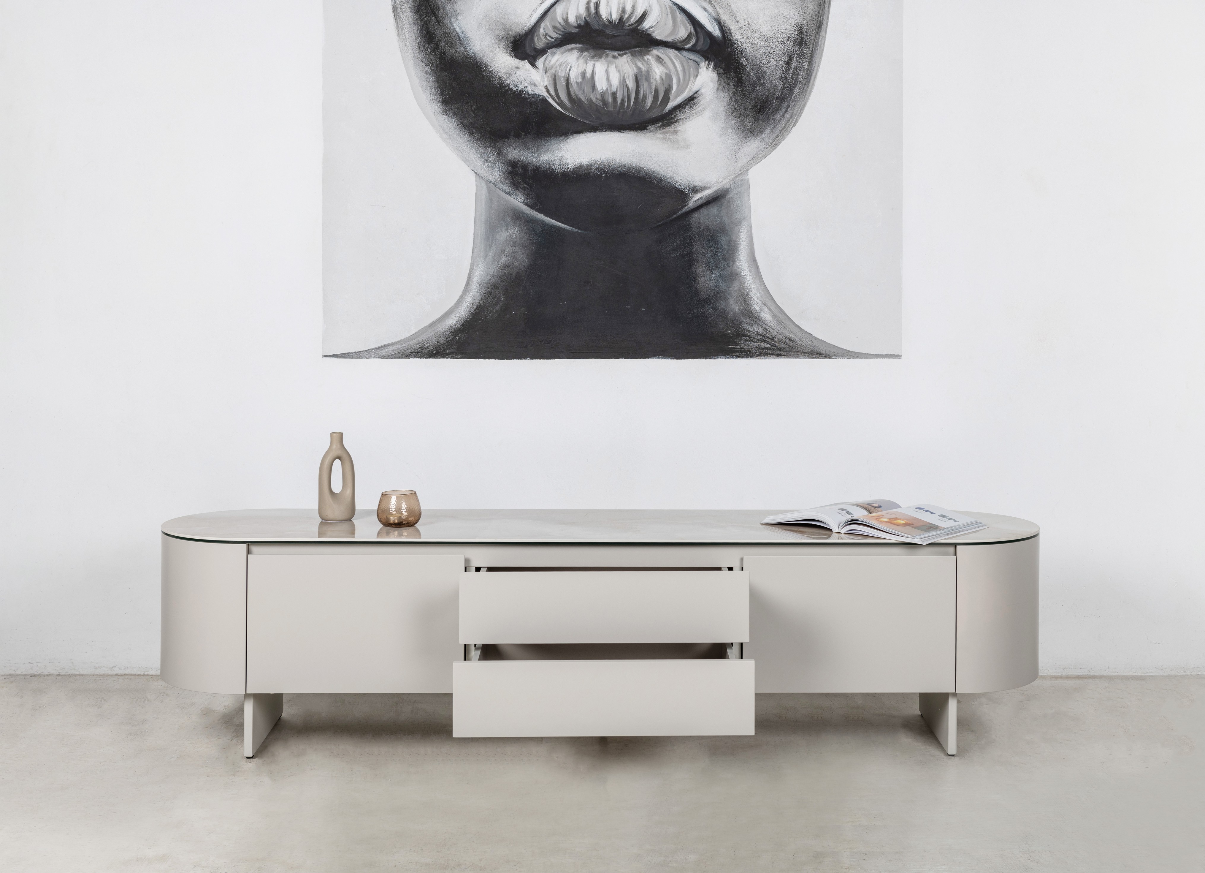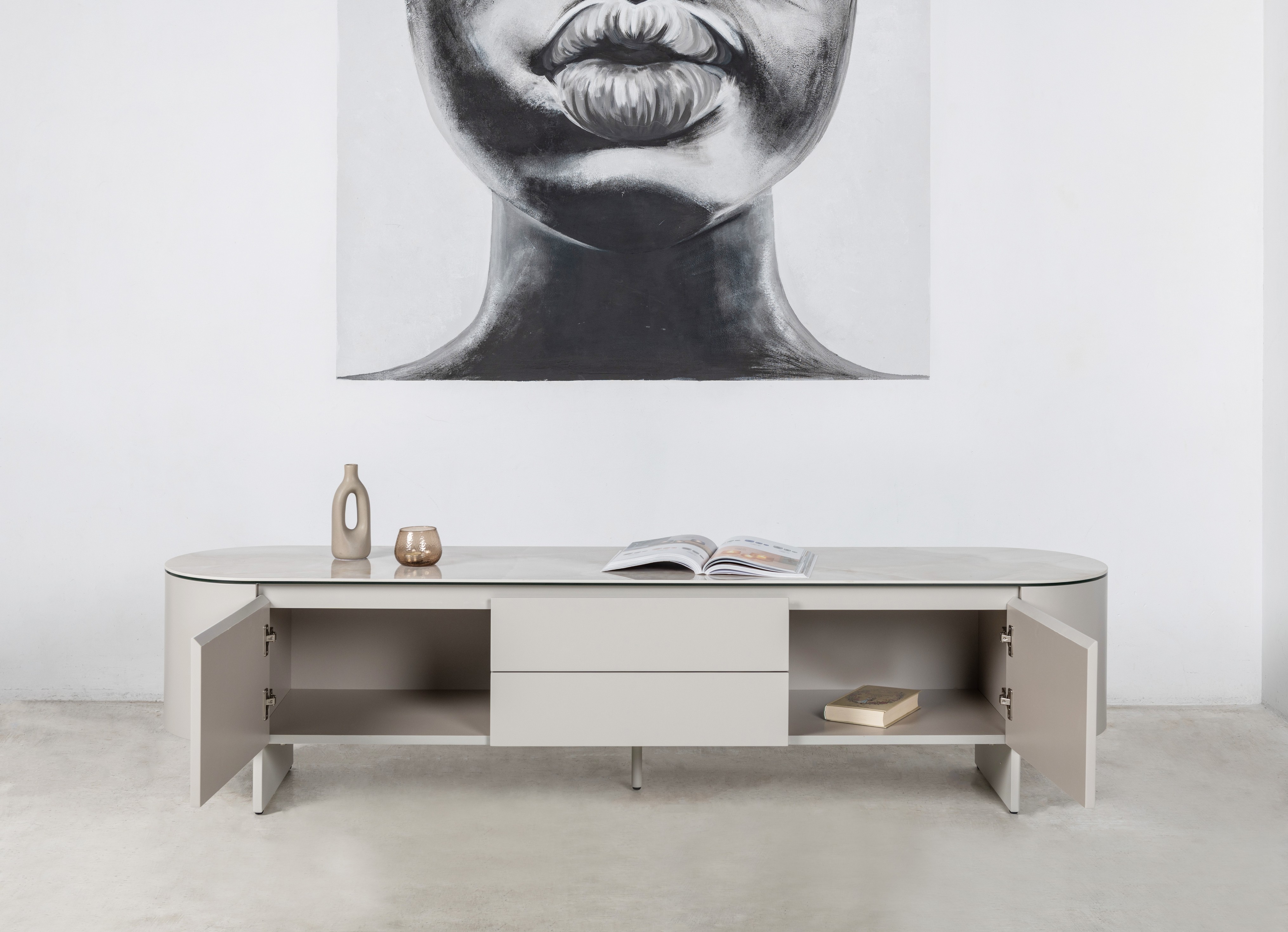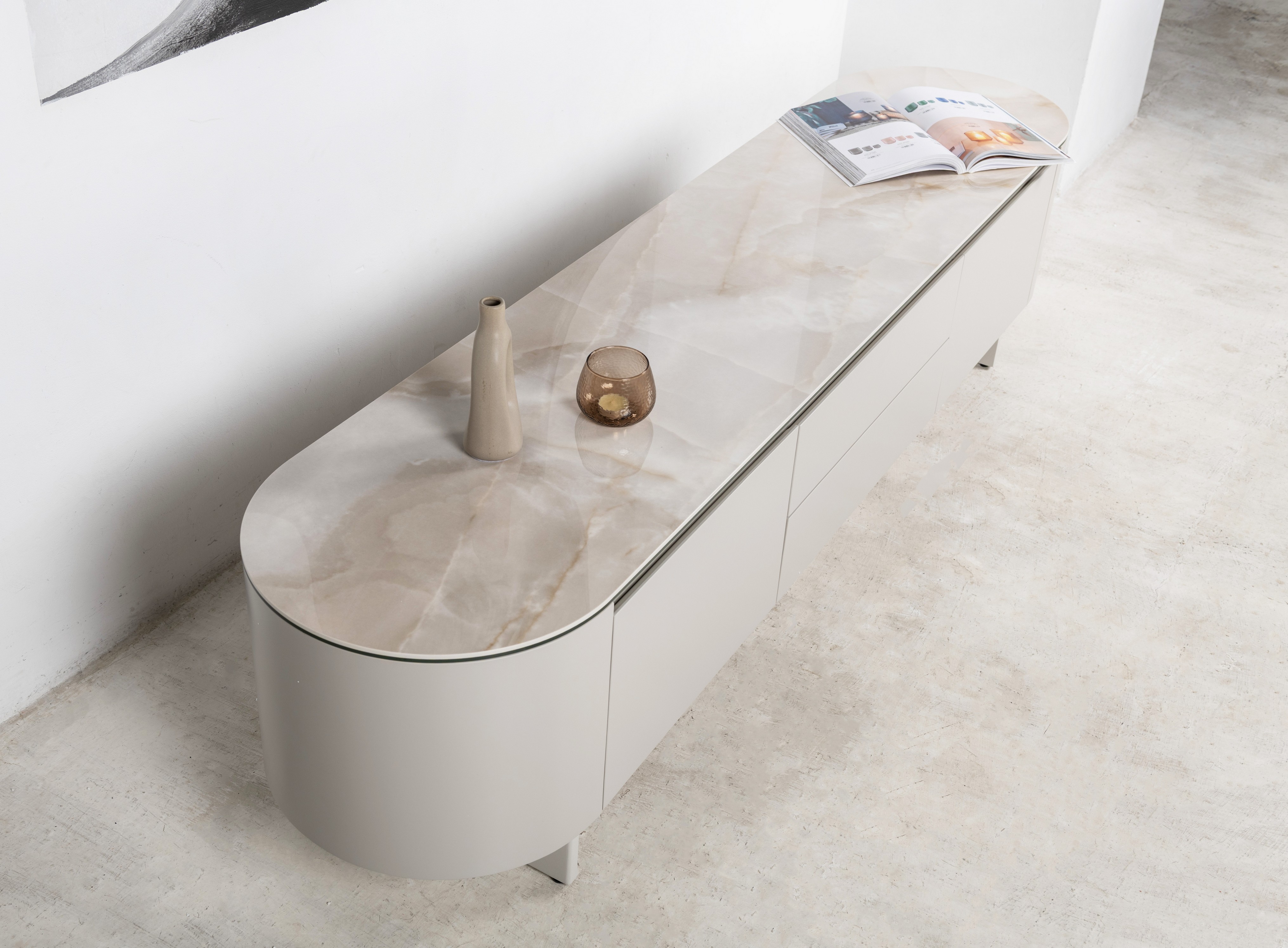ТВ-тумба “Лунаріо” айворі онікс + айворі — це елегантне поєднання сучасного дизайну, витончених форм і благородних матеріалів. Вона створена для інтер’єрів, де кожна деталь має значення, а стиль проявляється у стриманій розкоші.